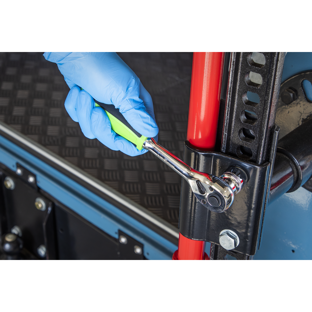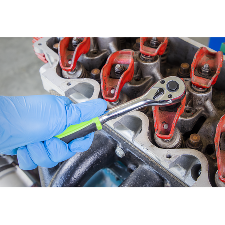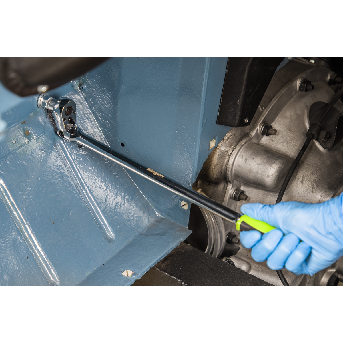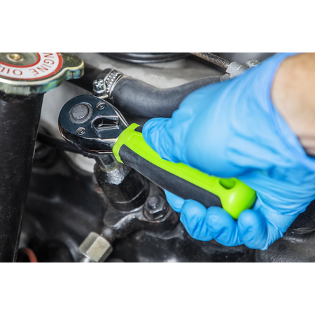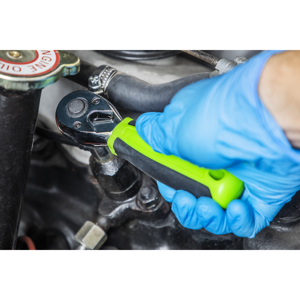 • REVERSIBLE RATCHET - Features pear-head with flip reverse, push-button quick release and anti-slip comfort grip.
