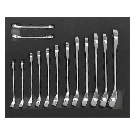 Drop-forged Chrome Vanadium steel combination spanners heat treated and chrome plated for corrosion resistance. Open-end and 12-point WallDrive® ring combination. Supplied in storage tray.