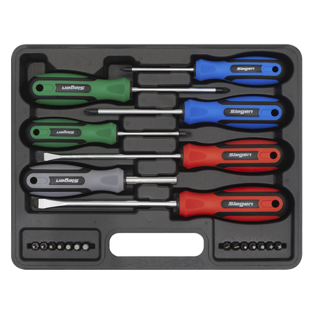 Selection of popular sized screwdrivers, bit driver and bits. Chrome Vanadium steel satin finish shafts with shot blasted and magnetized tips. Contoured soft grip handles with colour-coding for fast identification. Supplied in storage case.