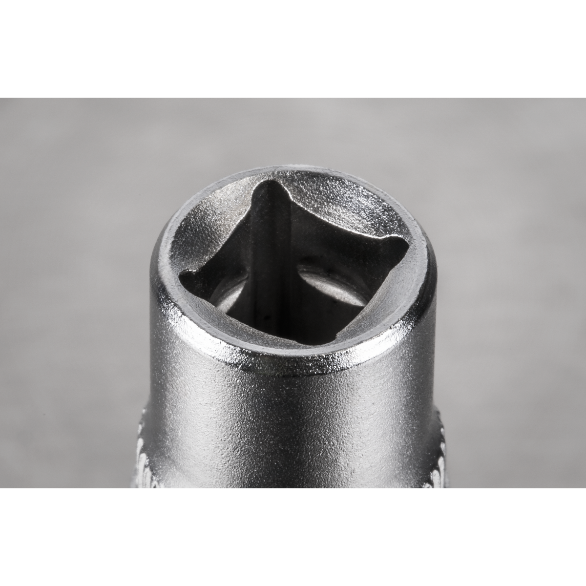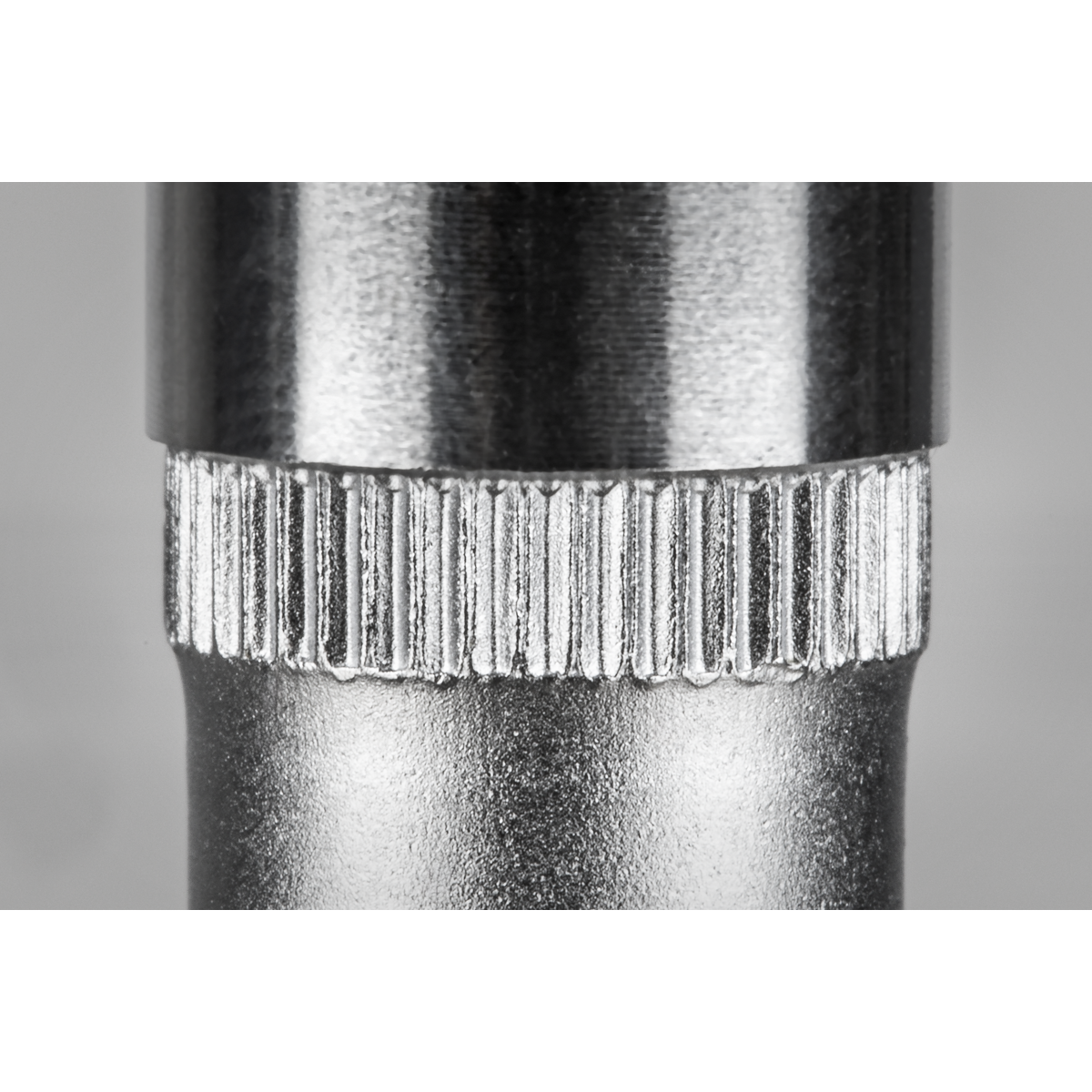 Cold-forged Chrome Vanadium steel socket. Hardened and tempered for added strength. Chrome plated in half chrome, half satin finish with knurled ring for extra grip with oily fingers. WallDrive® socket configuration.
