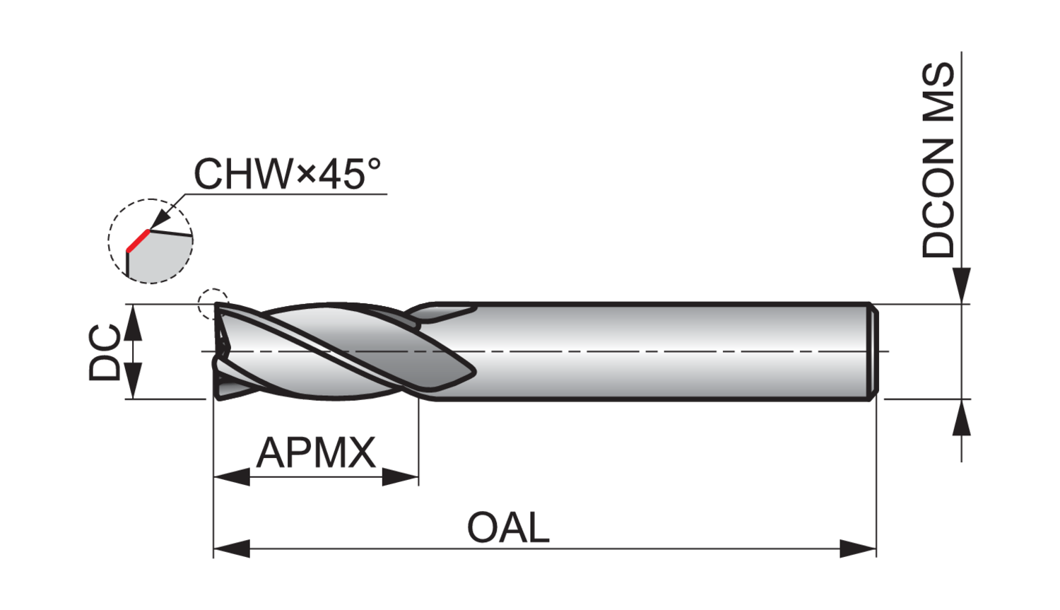 Regular length end mill with 4 flutes, diameter 14mm with 30mm length of cut, 83mm overall length and 0.2mm 45° chamfered corner edges, according to DORMER standard with a 14mm plain shank, solid carbide with bright finish, 30° helix and 12° rake angle for shoulder milling in free machining, plain carbon and alloy steel, malleable, ductile and compacted graphite cast-iron and copper or copper alloys