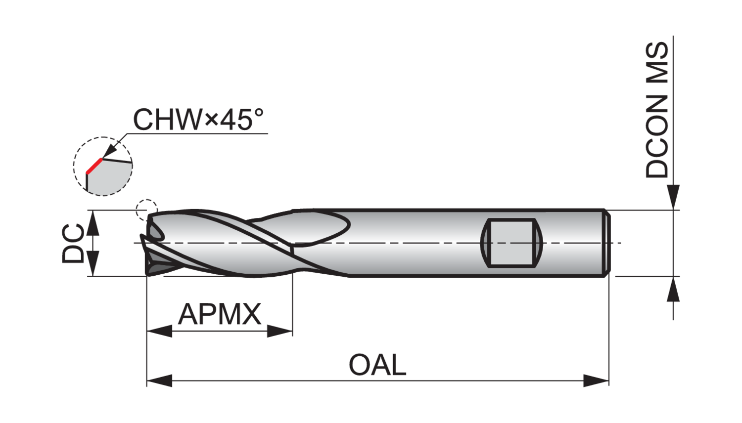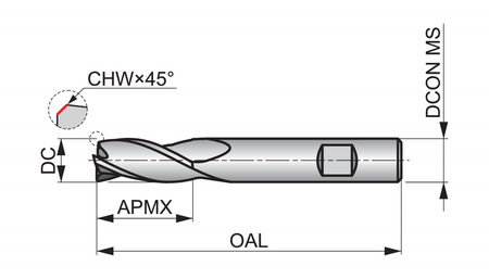 Regular length end mill with 3 flutes, diameter 2.5mm with 9mm length of cut, 38mm overall length and 0.08mm 45° chamfered corner edges, according to DORMER standard with a 3mm Weldon shank, solid carbide with TiAlN coating, 30° helix and 12° rake angle for shoulder milling and slot milling in steel and cast steel, cast-iron and cast aluminium and copper or copper alloys