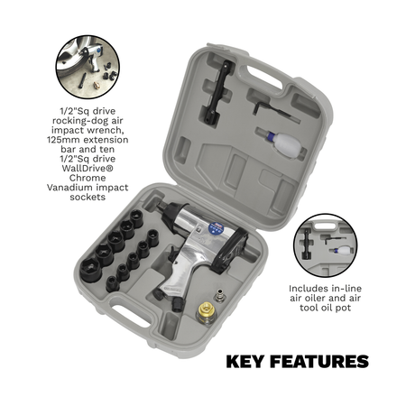 Comprises 1/2"Sq drive rocking-dog air impact wrench, 125mm extension bar and ten 1/2"Sq drive WallDrive® Chrome Vanadium impact sockets. Kit also includes in-line air oiler and air tool oil pot. Supplied in storage case.
