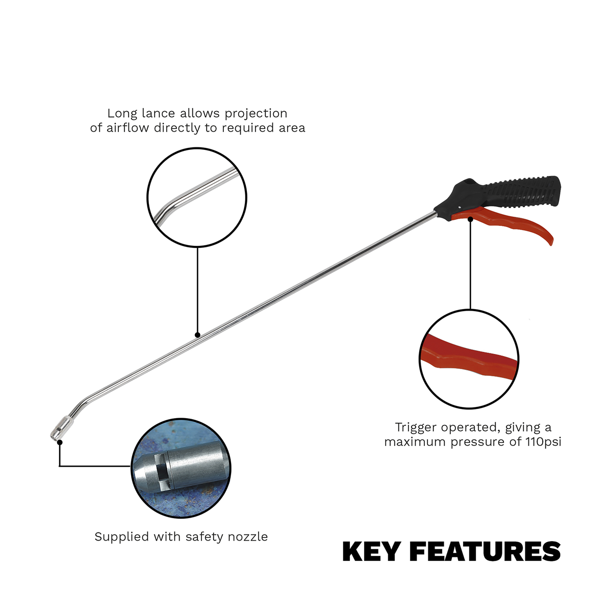 Trigger operated blow gun with extended lance. Fitted with brass air inlet ferrule. Suitable for quick removal of chips, dust and particulate from any surface. Ideal for use in the workshop or bodyshop. Long lance allows projection of airflow directly to required area. Supplied with safety nozzle. Maximum operating pressure 110psi.