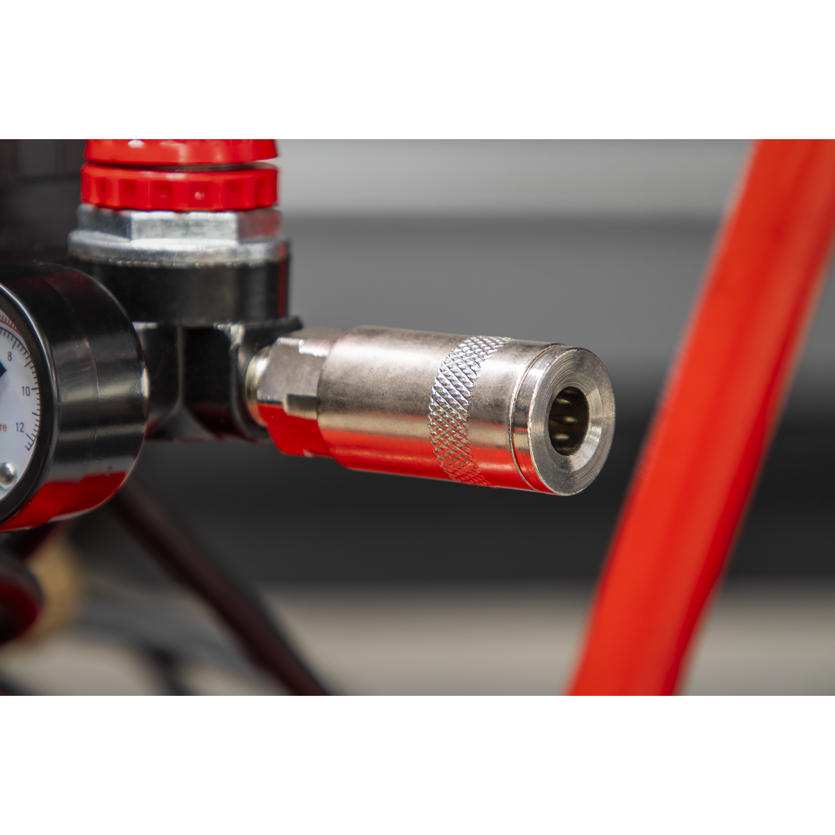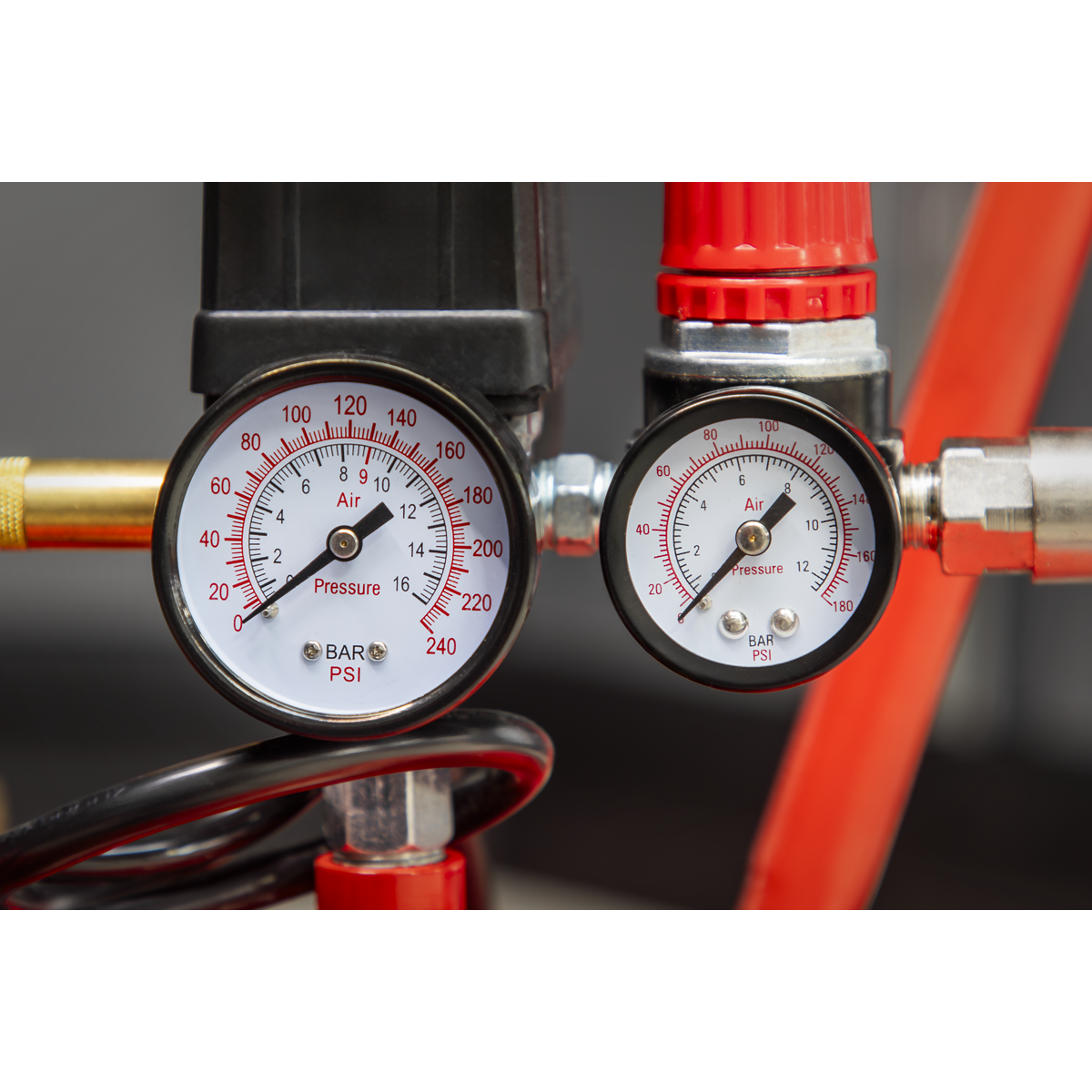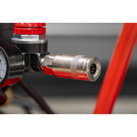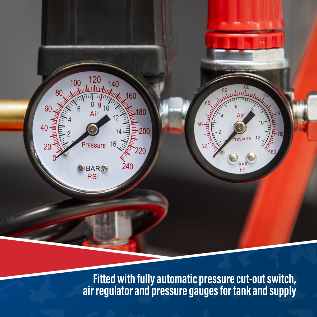 • Fitted with fully automatic pressure cut-out switch, air regulator and pressure gauges for tank and supply.