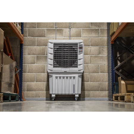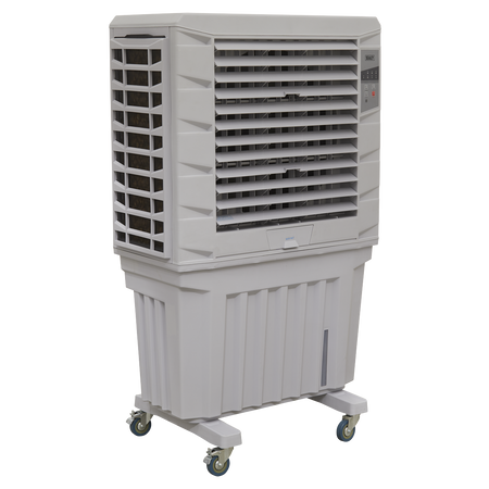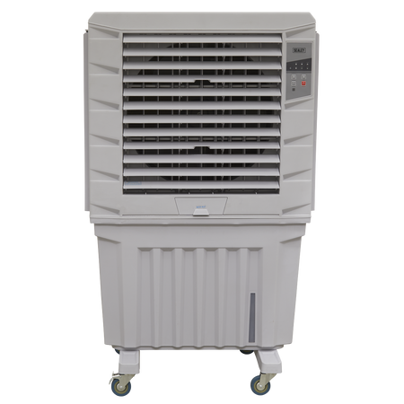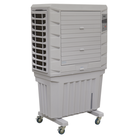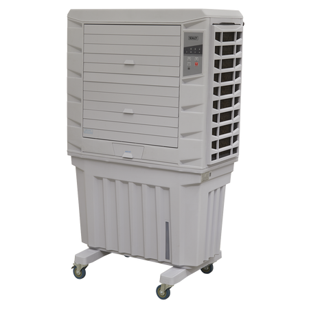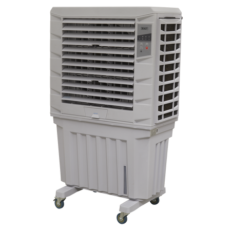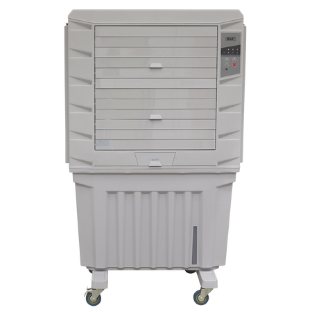 Portable, robust commercial air cooling unit. The cooler uses water evaporation technology with air movement to provide more economical cooling without refrigerants. Three easy touch wind speeds for desired airflow. Features two modes, Swing and Cool, allowing you to oscillate the fan and initiate the evaporation technology. Fully closable louvres and auto vertical louvre with long distance air throw. Large 125L water tank with inlet float valve and shortage alarm. Easy clean with removable high quality dust filters and honeycomb cooling pads on all three sides. Castor wheels make it easily transportable to any indoor application.