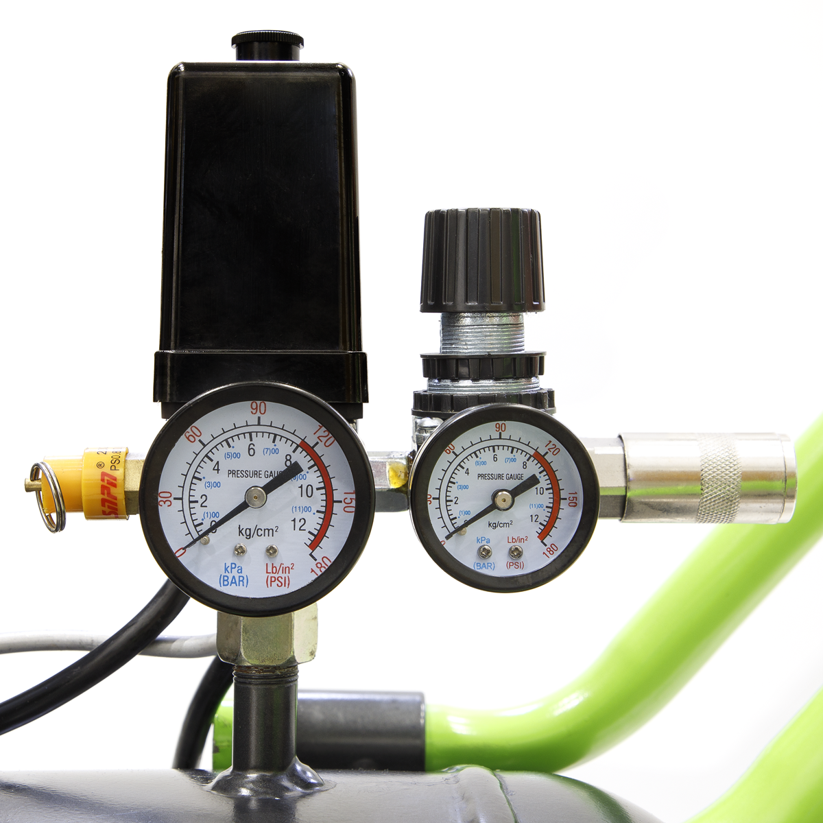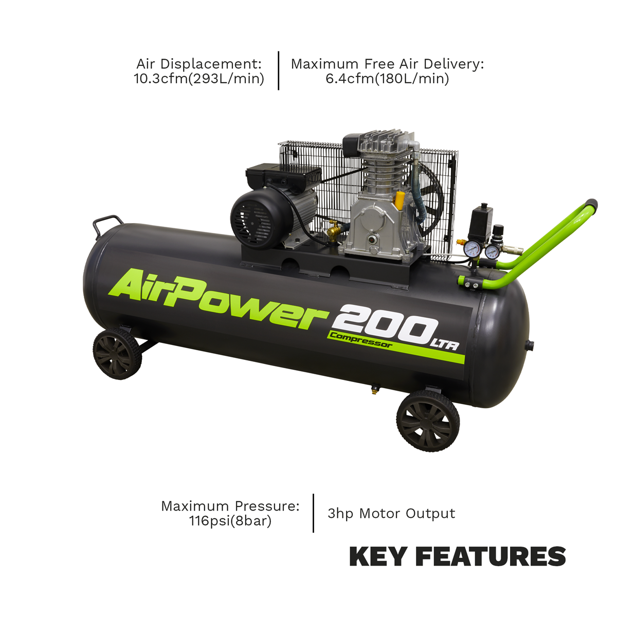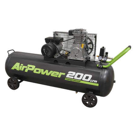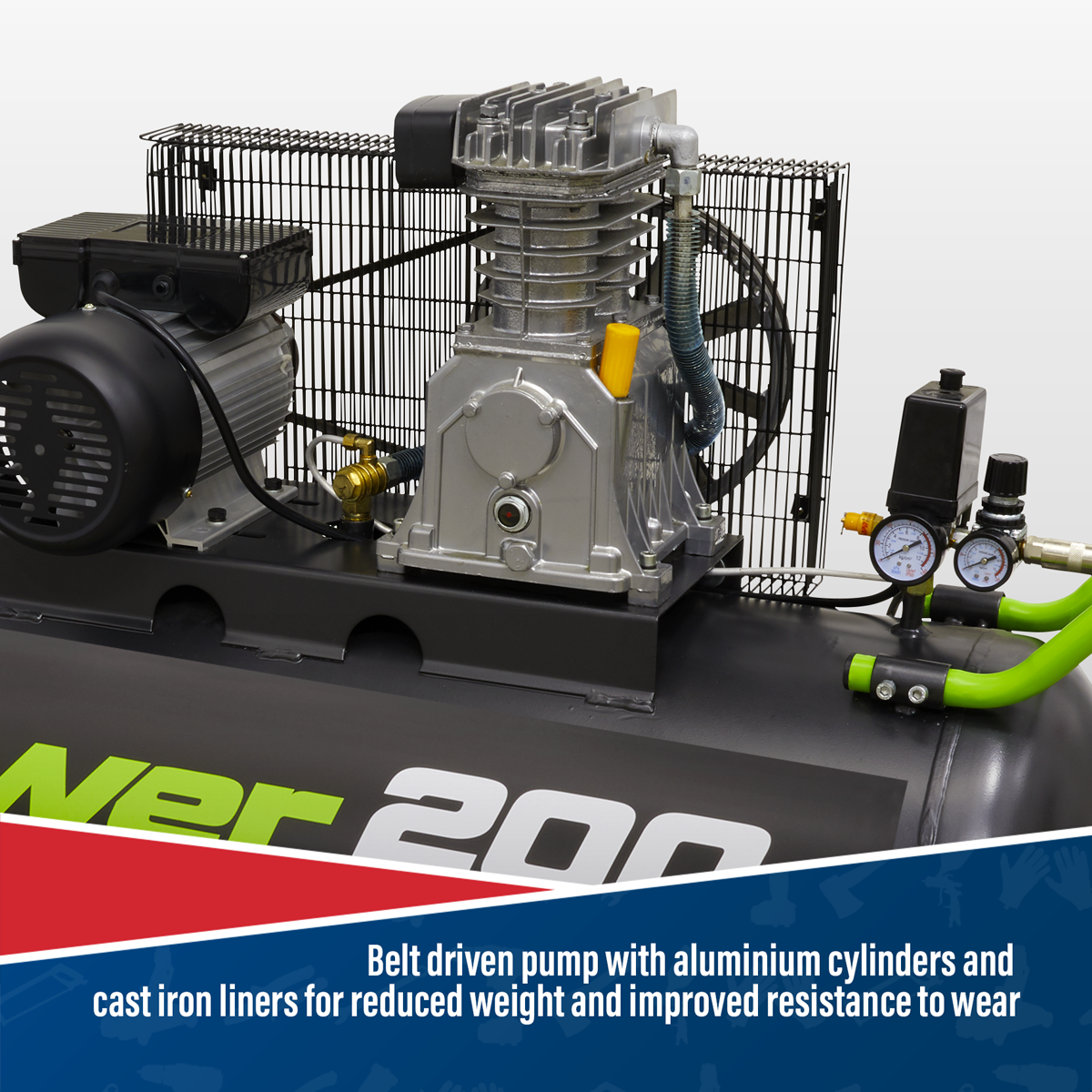 Belt driven pump with aluminium cylinders and cast iron liners for reduced weight and improved resistance to wear. Fitted with a 3hp motor. Heavy-duty drive guards protect belt and flywheel that is designed to force air over the pump to aid cooling. Suitable for general-purpose workshop applications.