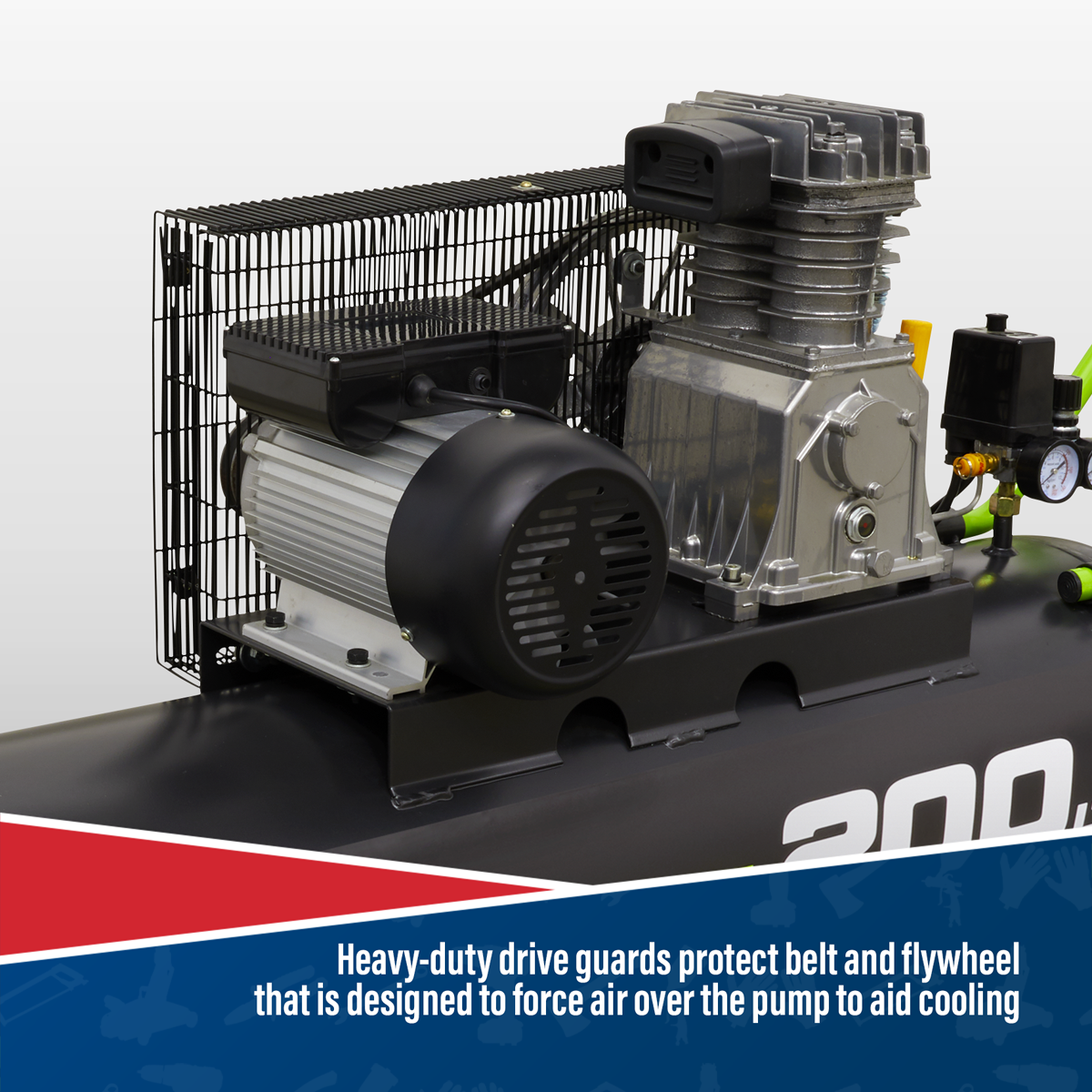 • Heavy-duty drive guards protect belt and flywheel that is designed to force air over the pump to aid cooling.