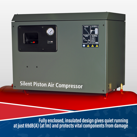 Heavy-duty low noise compressor suitable for garage, bodyshop and industrial applications. Fitted with cast iron cylinder head enabling slower revving and improved pump life. Fully enclosed, insulated design gives quiet running at just 69dB(A) (at 1m) and protects vital components from damage. Features fully automatic pressure cut-out switch and tank pressure gauge. Heavy-duty 3-phase electric motor with soft start feature. Control box features tachometer for monitoring use and optimizing service times.