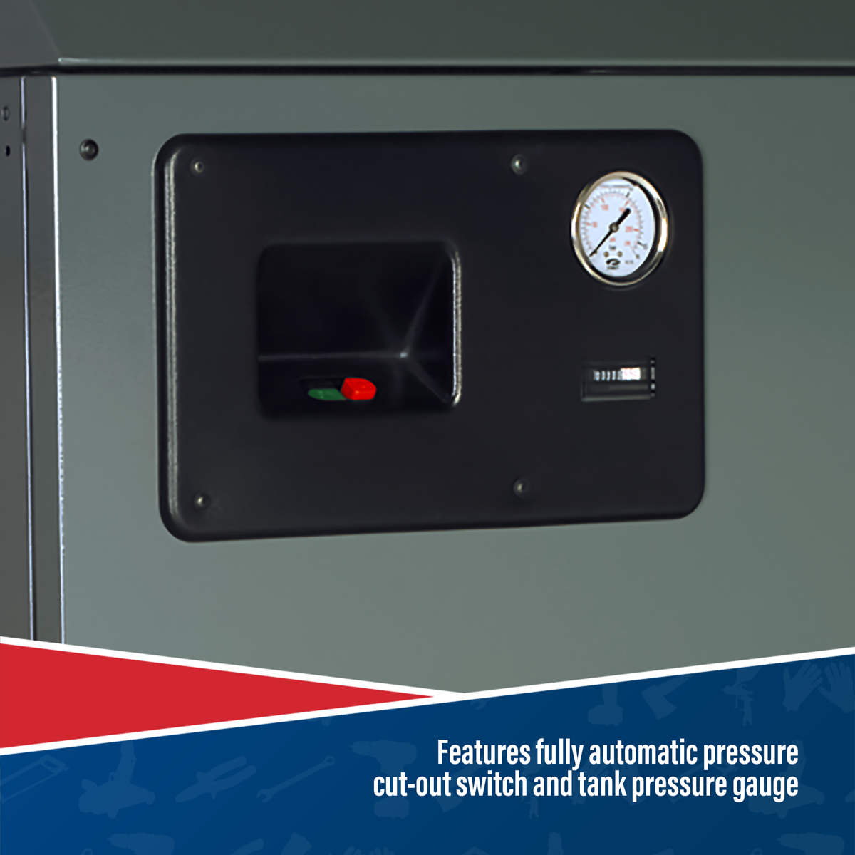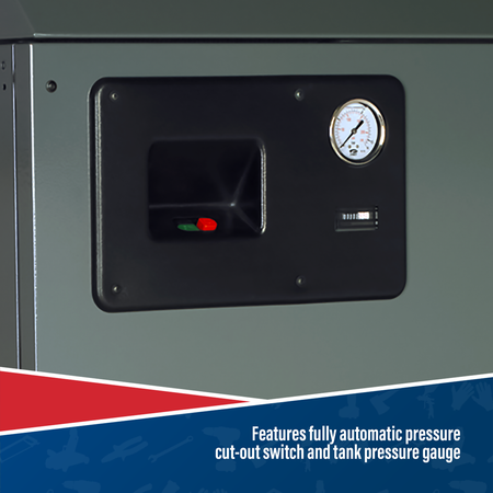 • Features fully automatic pressure cut-out switch and tank pressure gauge.