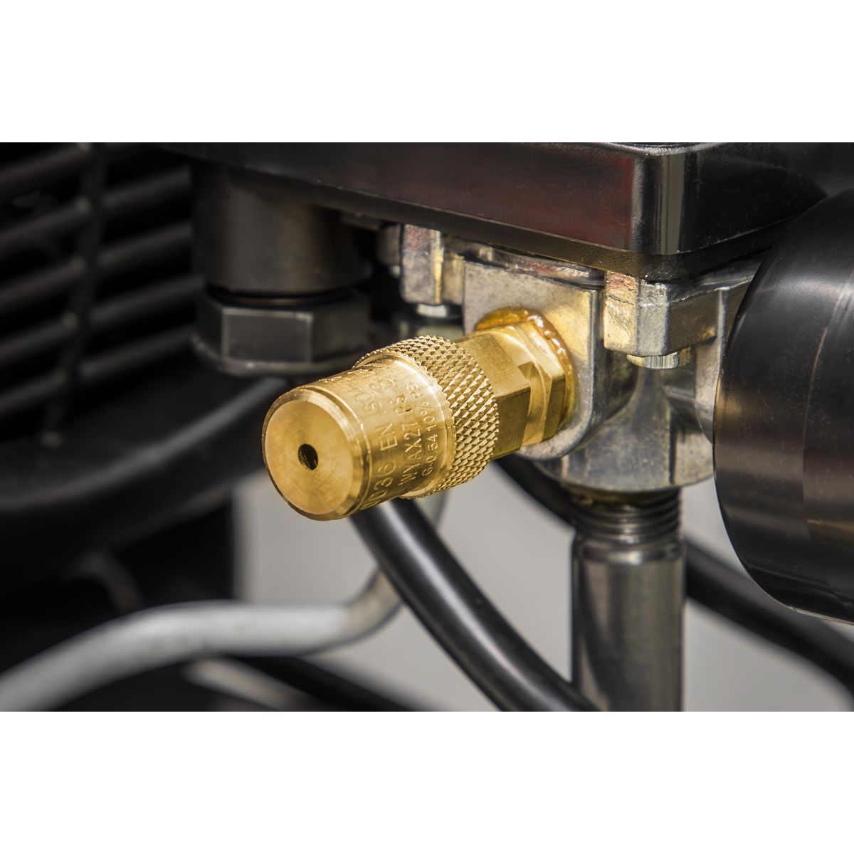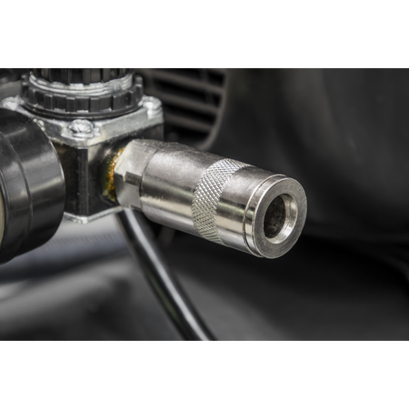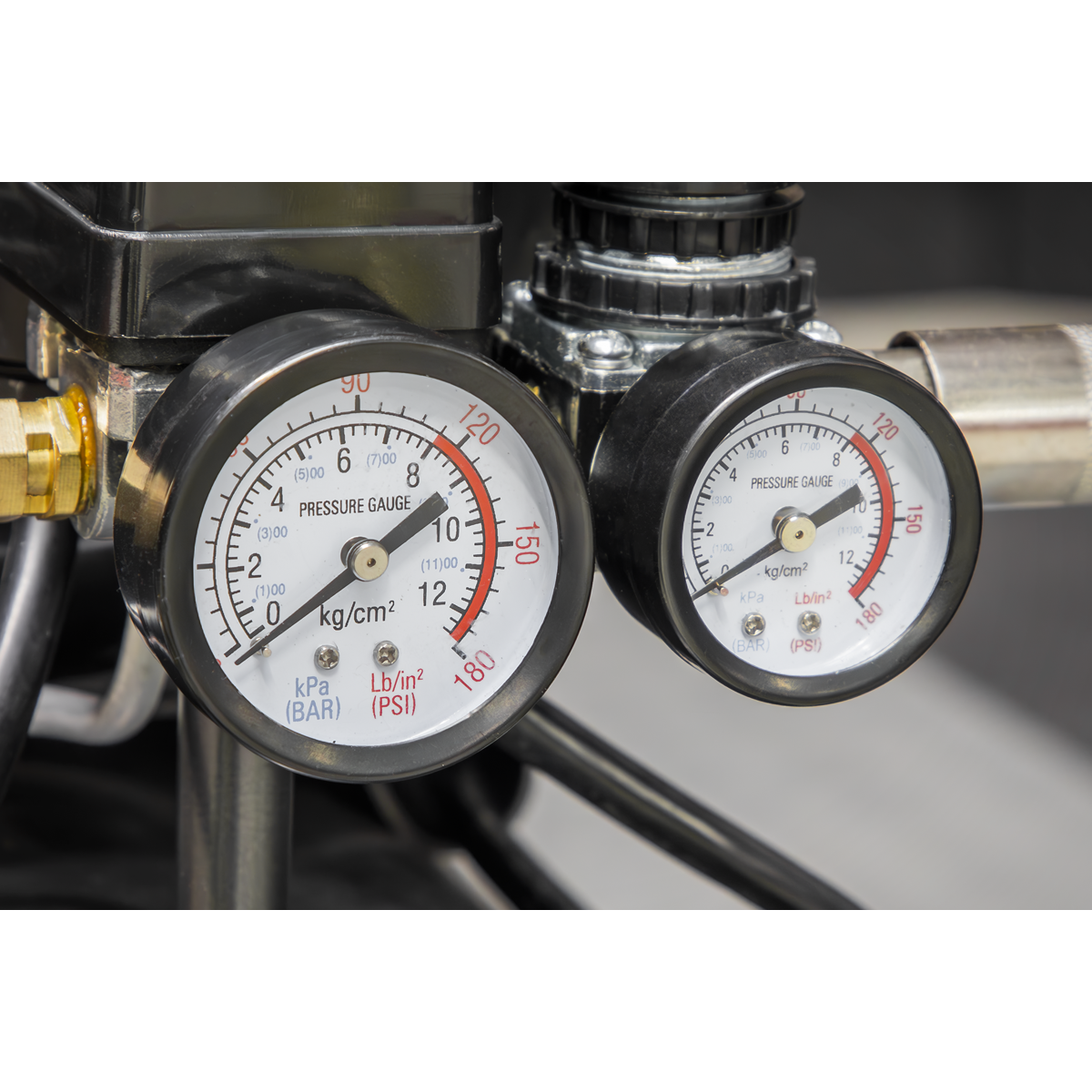 Aluminium cylinder head with cast iron cylinder gives added resistance to wear. Suitable for on site applications or anywhere that requires 110V. Pump head directly coupled to heavy-duty induction motor for reliable and smooth operation. Fitted with fully automatic pressure cut-out switch and twin gauges displaying tank and working pressures. Copper wound motor provides longer lasting performance.