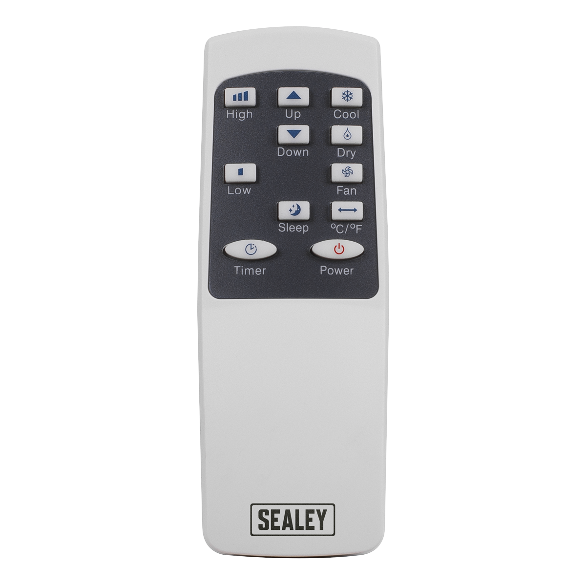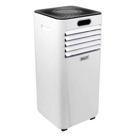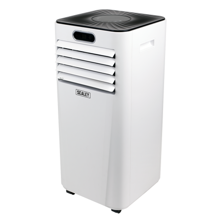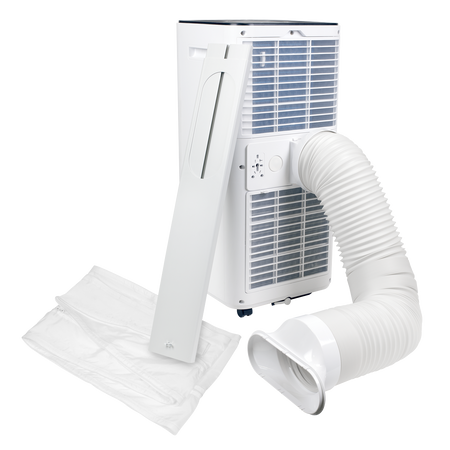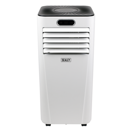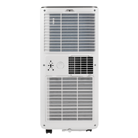 3-in-1 high capacity, compact, portable air conditioner, air cooling with ventilation and dehumidifying functions. Thermostatically controlled with built-in 24hr timer and sleep mode. Soft-touch control panel with LED digital display and remote control. Self-evaporating system reuses the moisture it collects from the air to help with the cooling process allows better efficiency, low maintenance and powerful cooling. Water-full indicator with auto-shut-off. Supplied with extendable exhaust ducting with window kit for ventilation. Dehumidifying function capable of removing up to 14.6L/day and includes continuous drain hose. Eco-Friendly R290 refrigerant. Air conditioning temperature range 16-32°C. Washable filter. Auto-defrost function at low ambient temperature. Mounted on castor wheels for manoeuvrability.