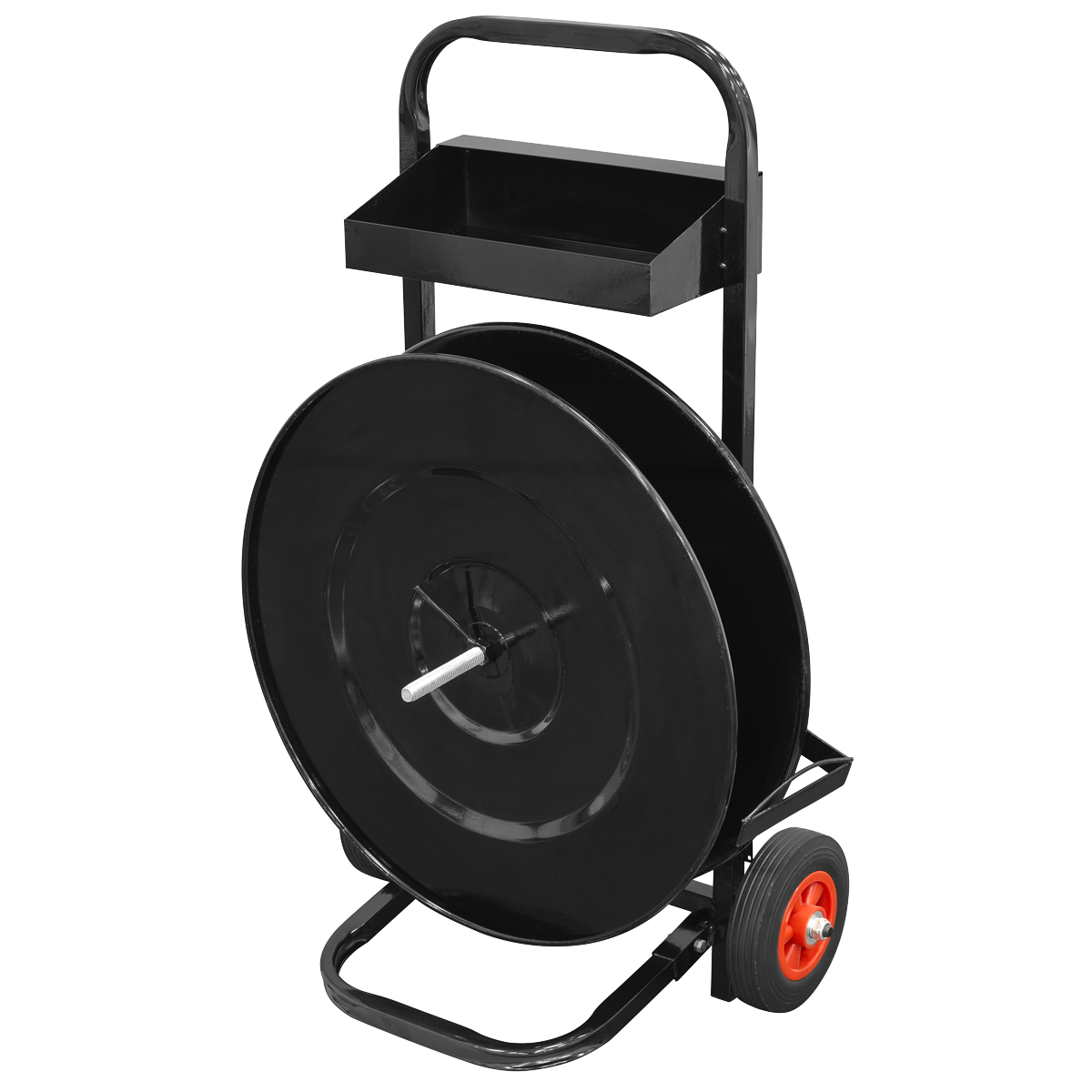 Features strap guide to keep strapping steady during use and drum brake for tangle free dispensing of the strap. Suitable for use with polypropylene, polyester and steel strapping with a 406mm inner core diameter and core width up to 200mm. Built-in storage tray for storing seals, tensioners, pliers and other equipment. Manufactured from high quality powder coated steel. Large diameter solid rubber wheels for use on all surfaces.,• EASY TO USE – Features strap guide to keep strapping steady during use and drum brake for tangle free dispensing of the strap.