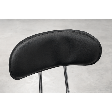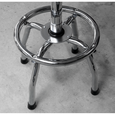 4-Legged heavy-duty steel construction with a polished Chrome plate finish for corrosion resistance. Heavy-duty Ø32mm strengthening ring for stability which also acts as a foot rest. Ø365mm Swivel seat features pneumatic height adjustment (695 to 815mm), rotates fully through 360° and is made from high-density foam with a black PU imitation leather cover for extra comfort and style.