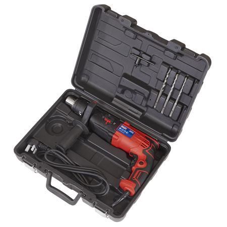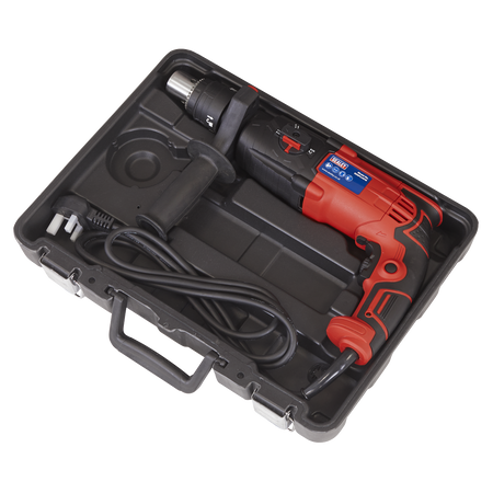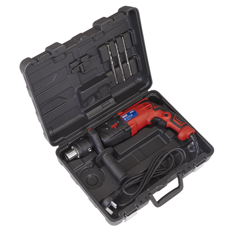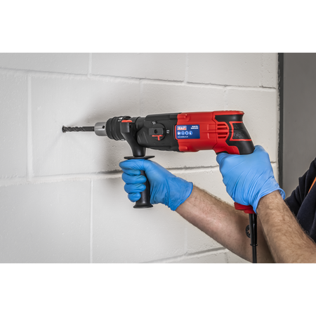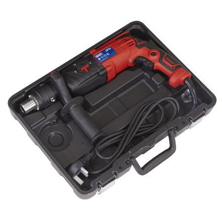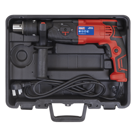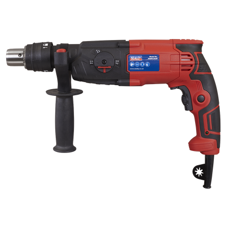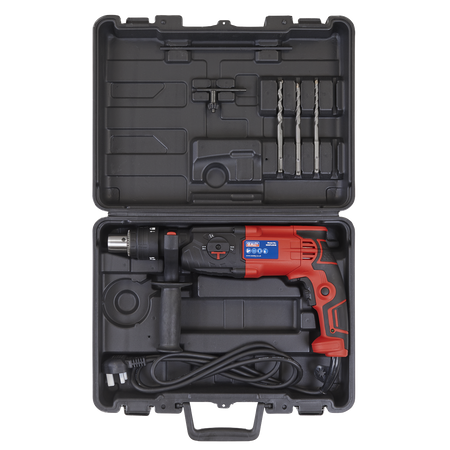 Powerful rotary hammer drill with patented double chuck that can be used with SDS, SDS Plus and drill bits. Three drilling functions. Variable speed control trigger. LED Mains power indicator. Supplied in storage case with 8mm, 10mm and 12mm masonry drill bits and depth gauge. Fitted with 360° auxiliary handle.