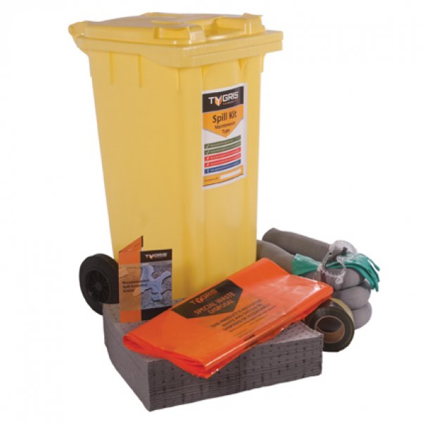 Benefits: The tough 2-wheeled bin makes the SK90(M) very easy to move around large sites; Ideal for absorbing Oils, Fuels, Solvents, Alcohols, Water & other common aqueous solutions; Product identification label to eliminate confusion; Contains Waste Disposal bags to ensure the waste is disposed of correctly; Contains an easy to read, step by step Spill Response Action Leaflet
