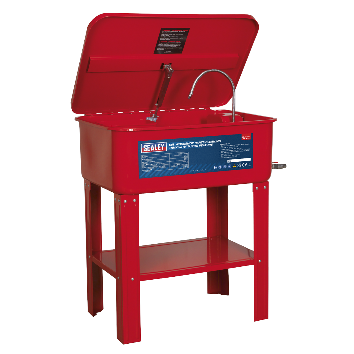Heavy-duty one-piece steel tank. Triple baked enamel finish and fitted with fully sealed, magnetic drive pump unit. Fluid recirculated through replaceable filter element and directed onto workpiece through flexible metal delivery nozzle. Turbo agitation, bubbles air through fluid to reduce soaking time and requires workshop air supply in addition to 230V electrical supply. Can be used without turbo agitation if desired. Lid of tank fitted with fusible link hinge which automatically snaps lid shut in the event of a fire. Supplied with removable shelf and parts basket.,• Heavy-duty one-piece steel tank.