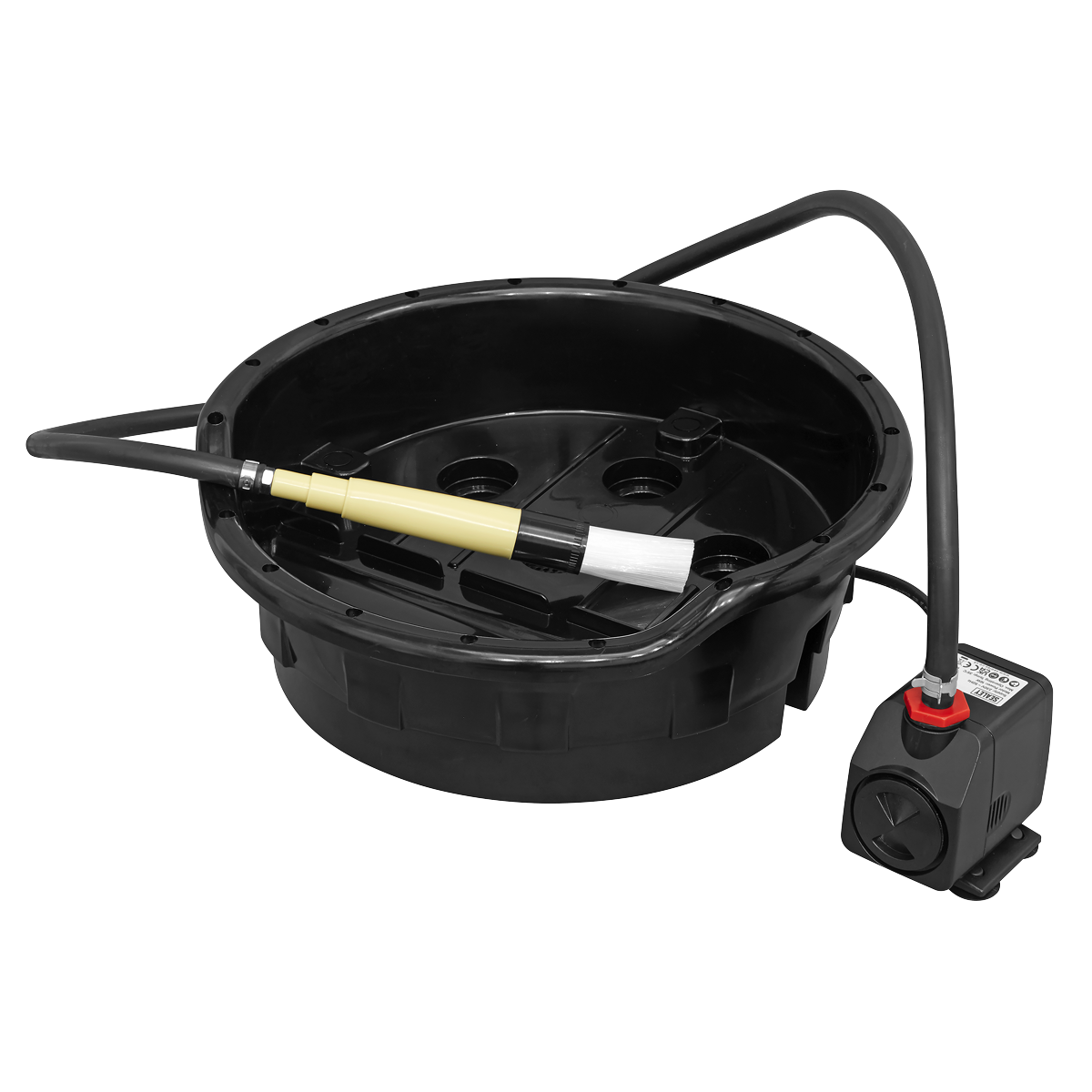 Lightweight and easy to move around the garage or workshop. Great for parts cleaning with any non-corrosive, water-based cleaning solutions. Simple to use with any 14L bucket, such as Sealey Model No. BM16 (bucket not included). Ideal for degreasing and cleaning small parts and tools with the hard bristle brush. Unique channel drainage system to simply catch waste material, and the variable speed pump sits in the bucket to pump the cleaning solution direct to the head of the brush for effective cleaning.,• PORTABLE - Lightweight and easy to move around the garage.