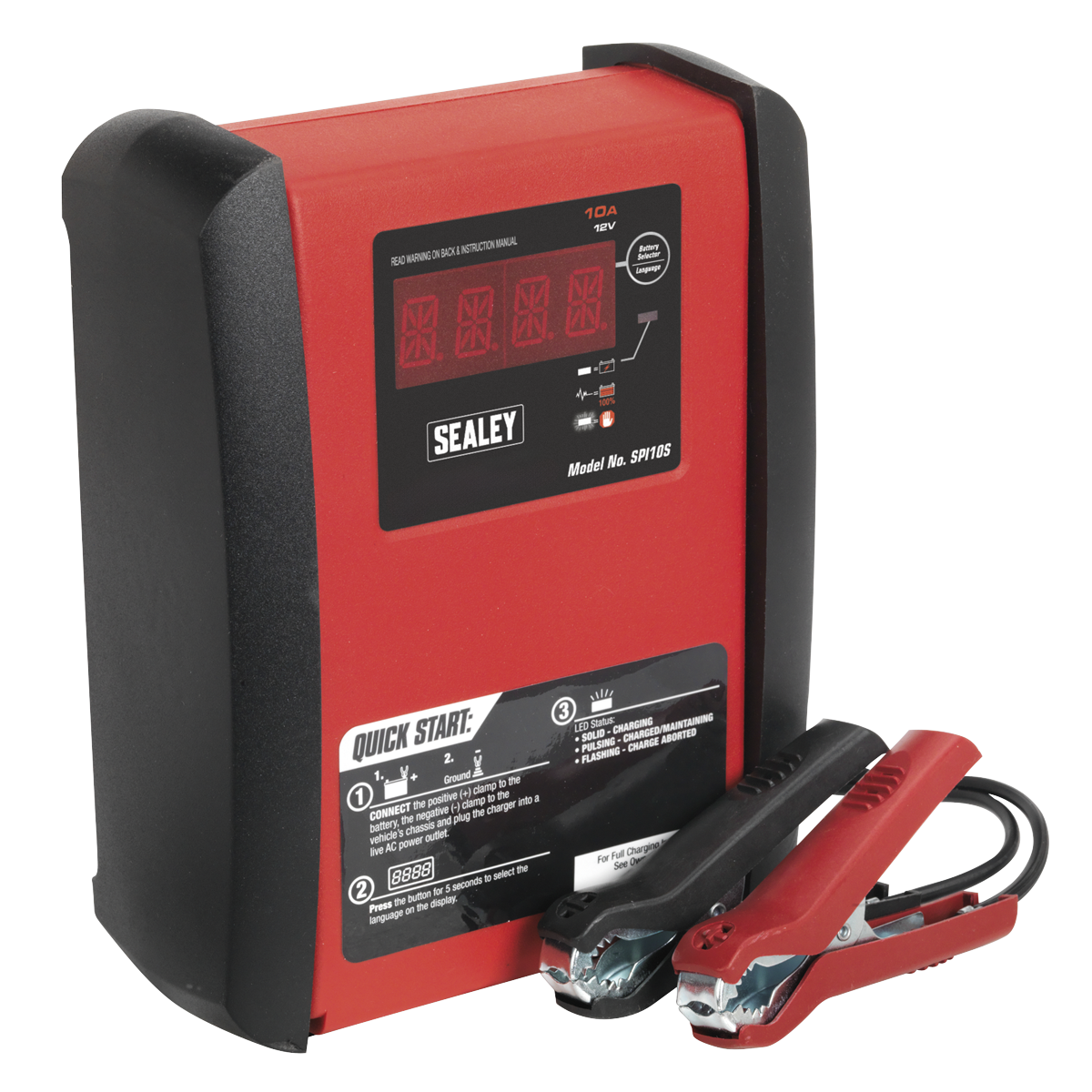 Fully automatic microprocessor controlled battery charger and maintainer, featuring patented Speed Charge technology. Charges the battery up to three times faster than conventional battery chargers without damaging the battery. Heavy-duty sturdy case with no-nonsense controls and LED status indicators. Battery presets include conventional lead acid, calcium, AGM/GEL, leisure and stop/start batteries. Fully automatic float mode ensures the battery is kept fully charged, maintained and ready to use.,• Output: 12V 10A.