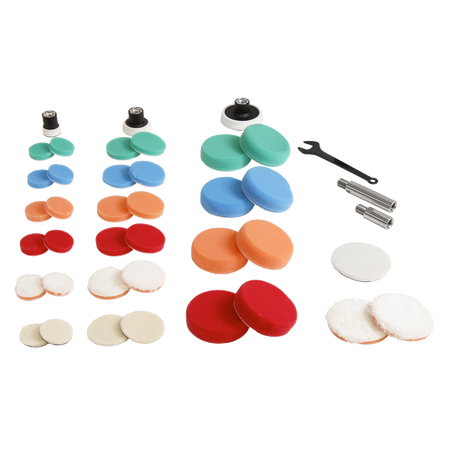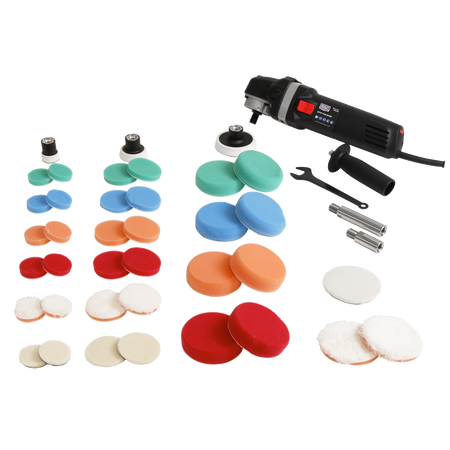 Rotary spot polisher kit with ergonomic slim body design. 6-Stage variable speed control from 700-2500rpm. Spindle lock for easy pad and shaft changes. Soft start for greater control. Fitted with 5m mains cable. Supplied with a selection of polishing pads, side handle and spare brushes.