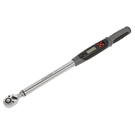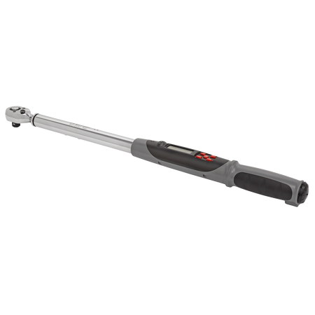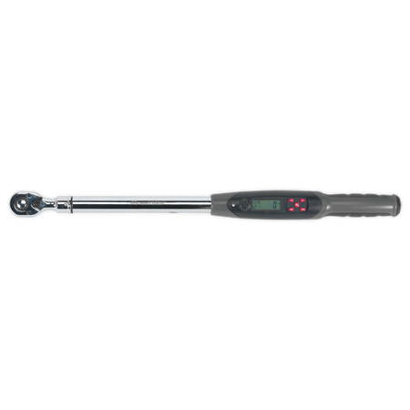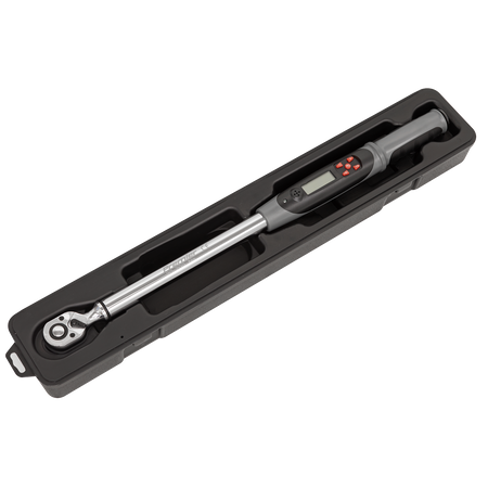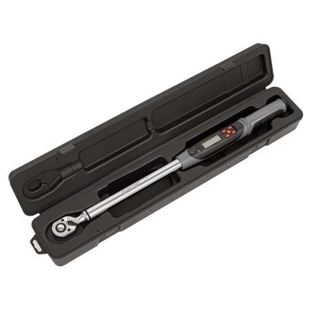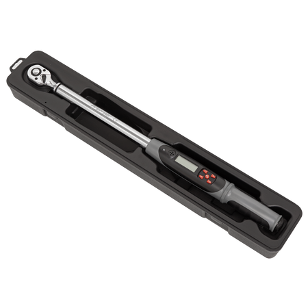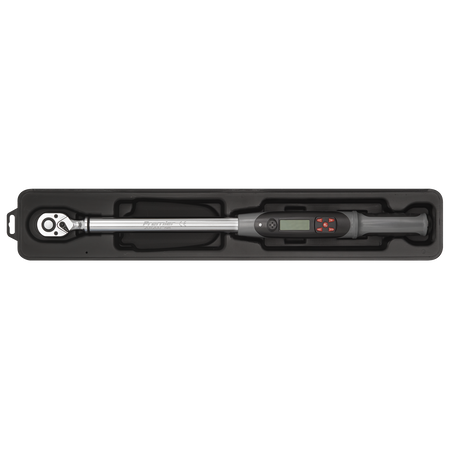 Rugged and resilient digital torque wrench suitable for workshop and factory use. LCD read-out with LED, vibration and audible alarms to indicate achieved and target torque levels. Features angle mode, eliminating the need for angle gauges and protractors providing an accurate and fast way to measure torque plus angle tightening sequences. Will also accumulate angle measurement when multiple turns are required, ideal for use where access is limited. Selectable track or peak modes and up to five user preset memories available. Read-outs in Nm, lb.in, lb.ft, kgf.m or degrees. Reversible Chrome Vanadium 72-tooth ratchet allows torque reading in either direction. Accurate to ±2% of wrench’s stated capacity. Supplied with test certificate and storage case.