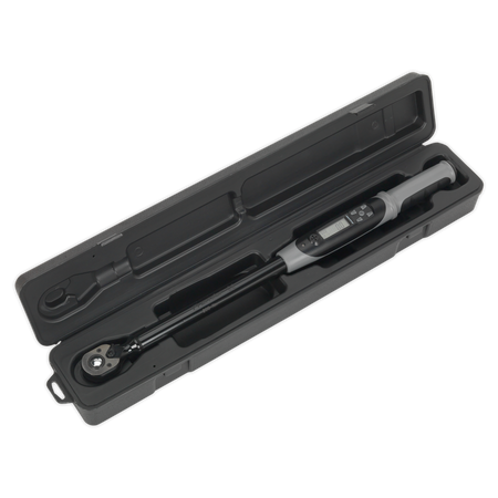 Rugged and resilient digital torque wrench suitable for workshop and factory use. LCD read-out with LED, vibration and audible alarms to indicate achieved and target torque levels. Features angle mode, eliminating the need for angle gauges and protractors providing an accurate and fast way to measure torque plus angle tightening sequences. Will also accumulate angle measurement when multiple turns are required, ideal for use where access is limited. Selectable track or peak modes and up to five user preset memories available. Read-outs in Nm, lb.in, lb.ft, kgf.m or degrees. Reversible Chrome Vanadium 72-tooth ratchet allows torque reading in either direction. Machined and lacquered head with a fully polished black chrome finish. Accurate to ±2% of wrench’s stated capacity. Supplied with test certificate and storage case.