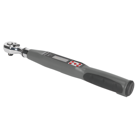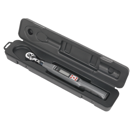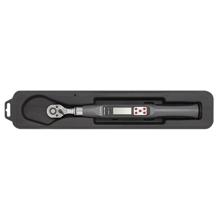 Rugged and resilient digital torque wrench suitable for workshop and factory use. LCD read-out with LED, audible alarm and vibration indicating achieved and target torque levels. Selectable track or peak modes and up to five user preset memories available. Read-outs in Nm, lb.in, lb.ft or kgf.m. Reversible Chrome Vanadium 72-tooth ratchet allows torque reading in either direction. Accurate to ±2% of wrench’s stated capacity. Supplied with test certificate and storage case.