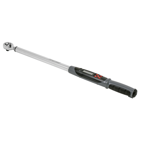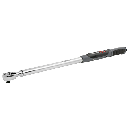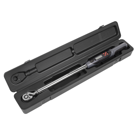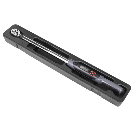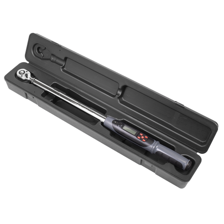Rugged and resilient digital torque wrench suitable for workshop and factory use. LCD read-out with LED, vibration and audible alarms to indicate achieved and target torque levels. Features angle mode, eliminating the need for angle gauges and protractors providing an accurate and fast way to measure torque plus angle tightening sequences. Will also accumulate angle measurement when multiple turns are required, ideal for use where access is limited. Selectable track or peak modes and up to five user preset memories available. Read-outs in Nm, lb.in, lb.ft, kgf.m or degrees. Reversible Chrome Vanadium 72-tooth ratchet allows torque reading in either direction. Accurate to ±2% of wrench’s stated capacity. Supplied with test certificate and storage case.