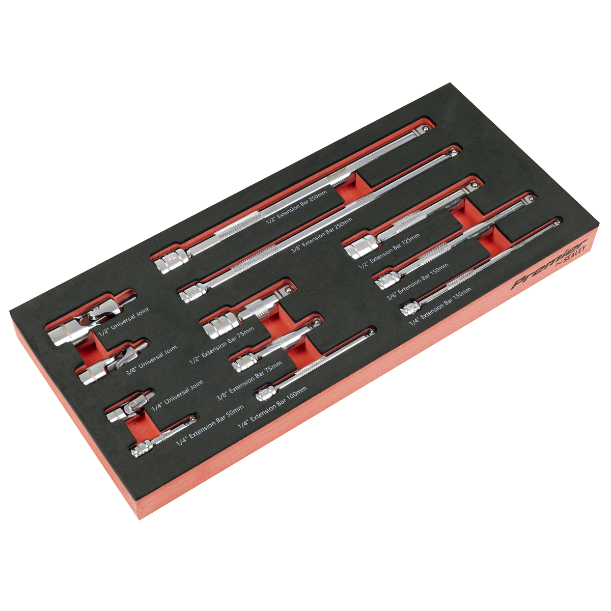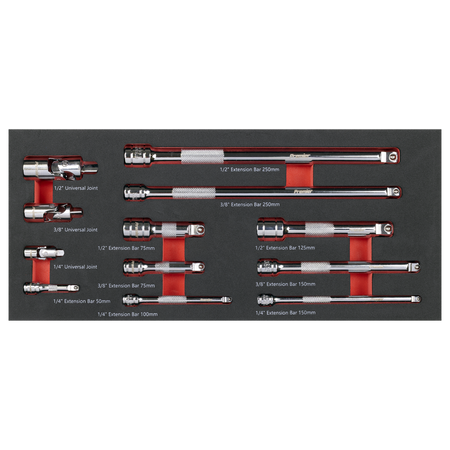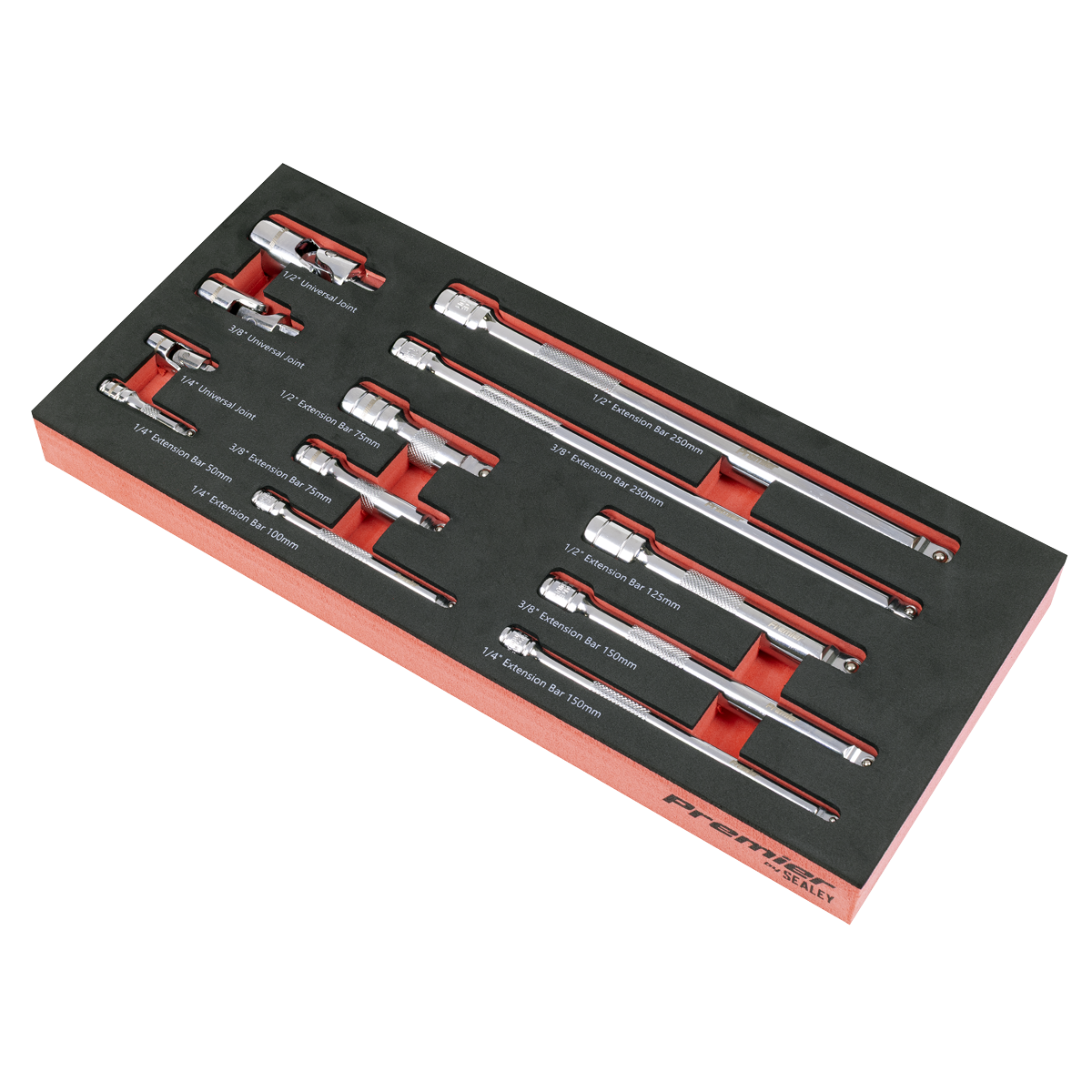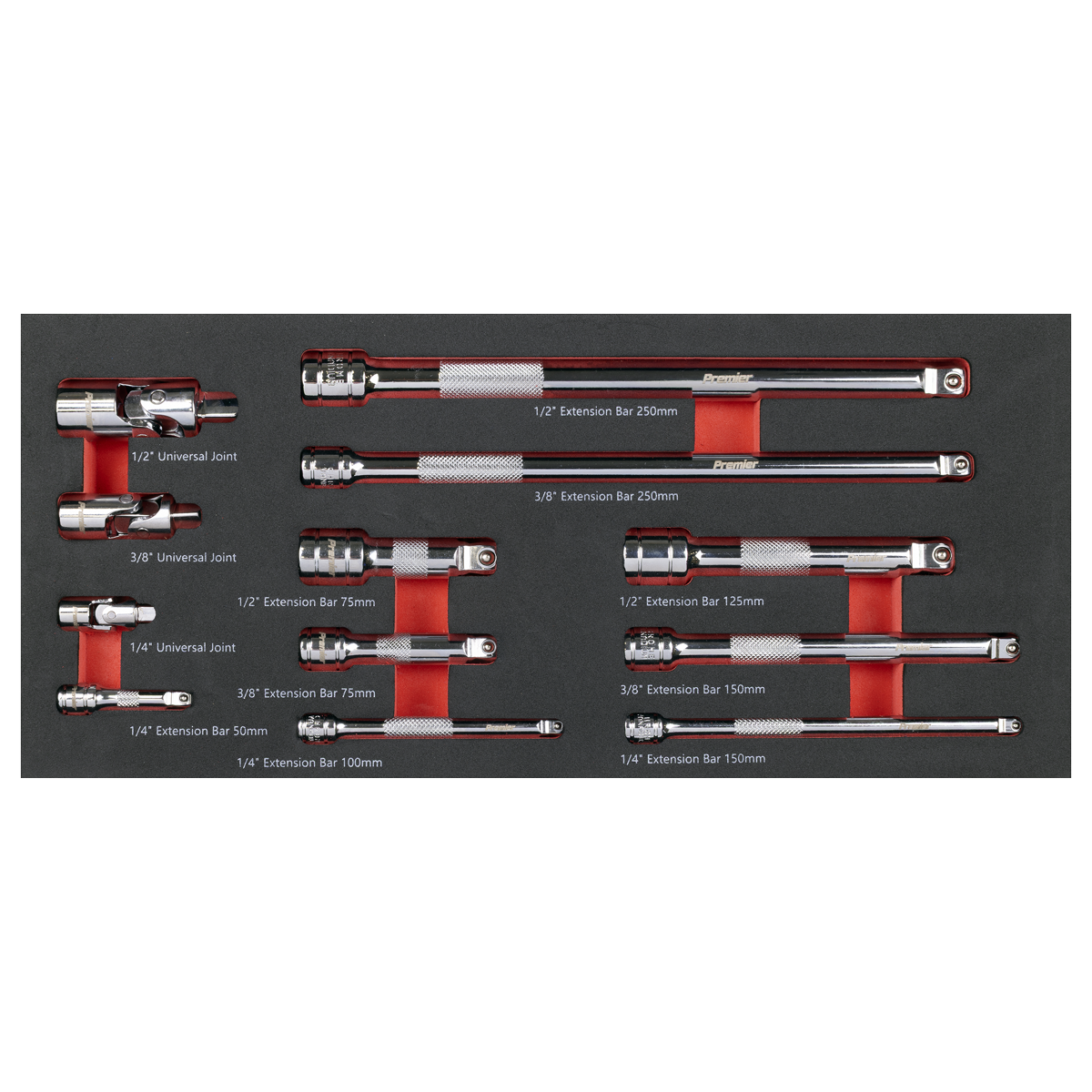 - Contents Extension Bars 1/4"Sq Drive; 50, 100, 150mm, 3/8"Sq Drive; 75, 150, 250mm, 1/2"Sq Drive; 75, 125, 250mm, Universal Joints; 1/4", 3/8", 1/2"Sq Drive