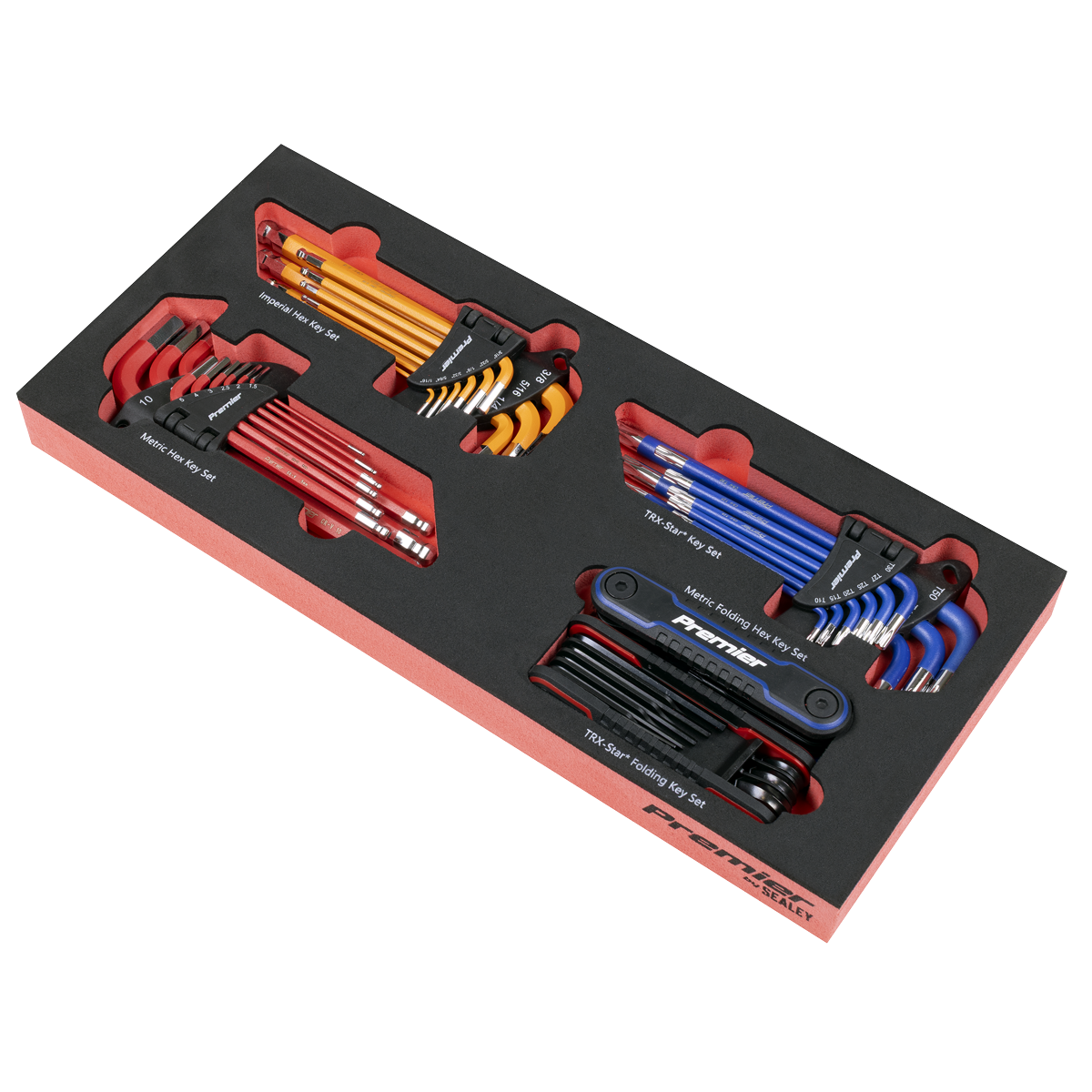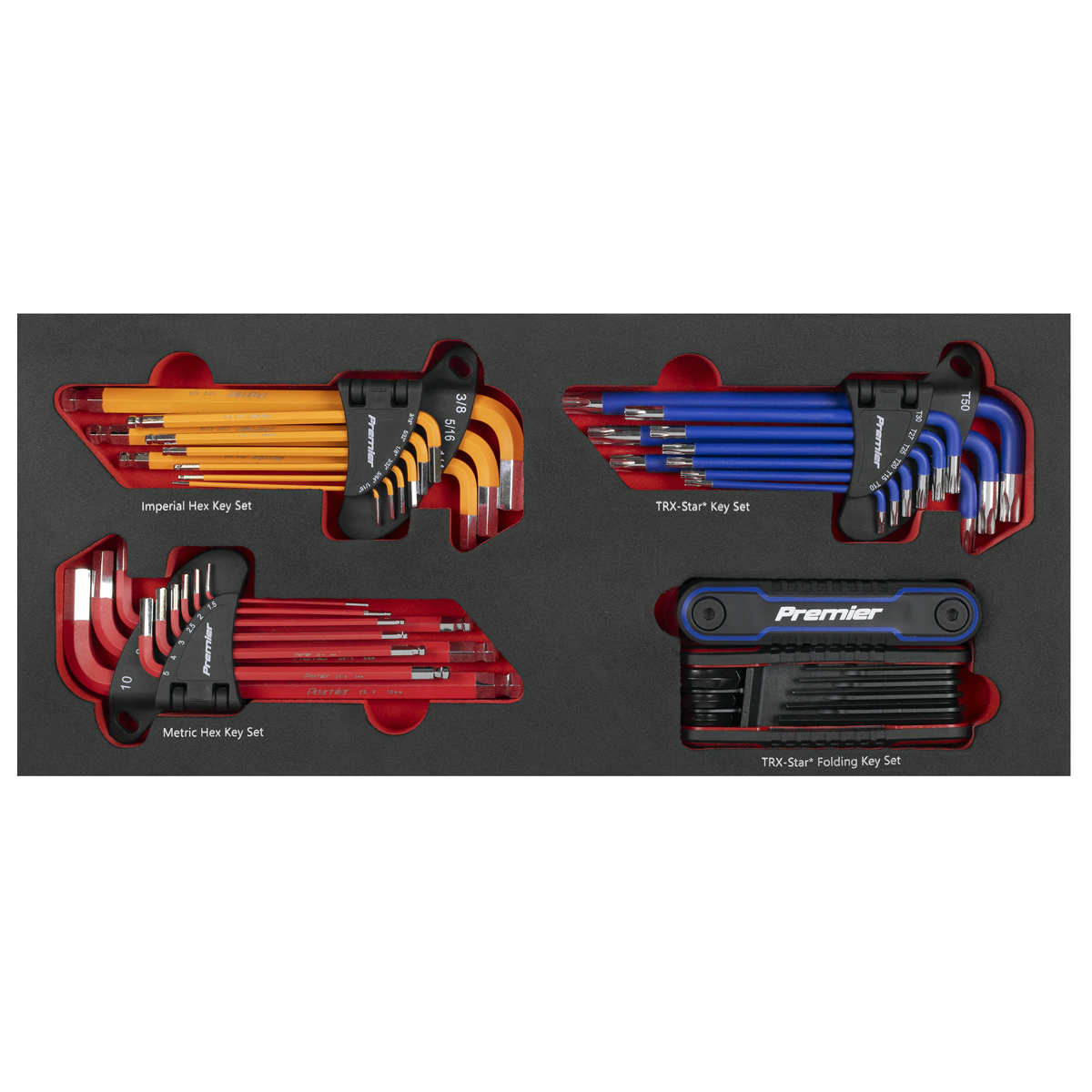 - Contents Hex Keys; 1.5, 2, 2.5, 3, 4, 5, 6, 8, 10mm, Imperial Hex Keys; 1/16", 5/64", 3/32", 1/8", 5/32", 3/16", 1/4", 5/16", 3/8", TRX-Star* Keys; T10, T15, T20, T25, T27, T30, T40, T45, T50, Folding Hex Keys; 1.5, 2, 2.5, 3, 4, 5, 6, 8mm. Folding TRX-Star* Keys; T9, T10, T15, T20, T25, T27, T30, T40
