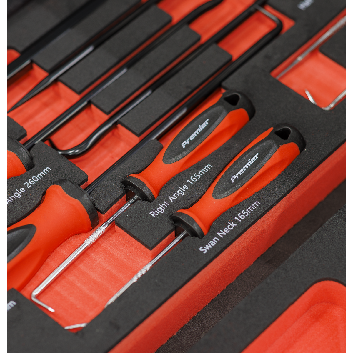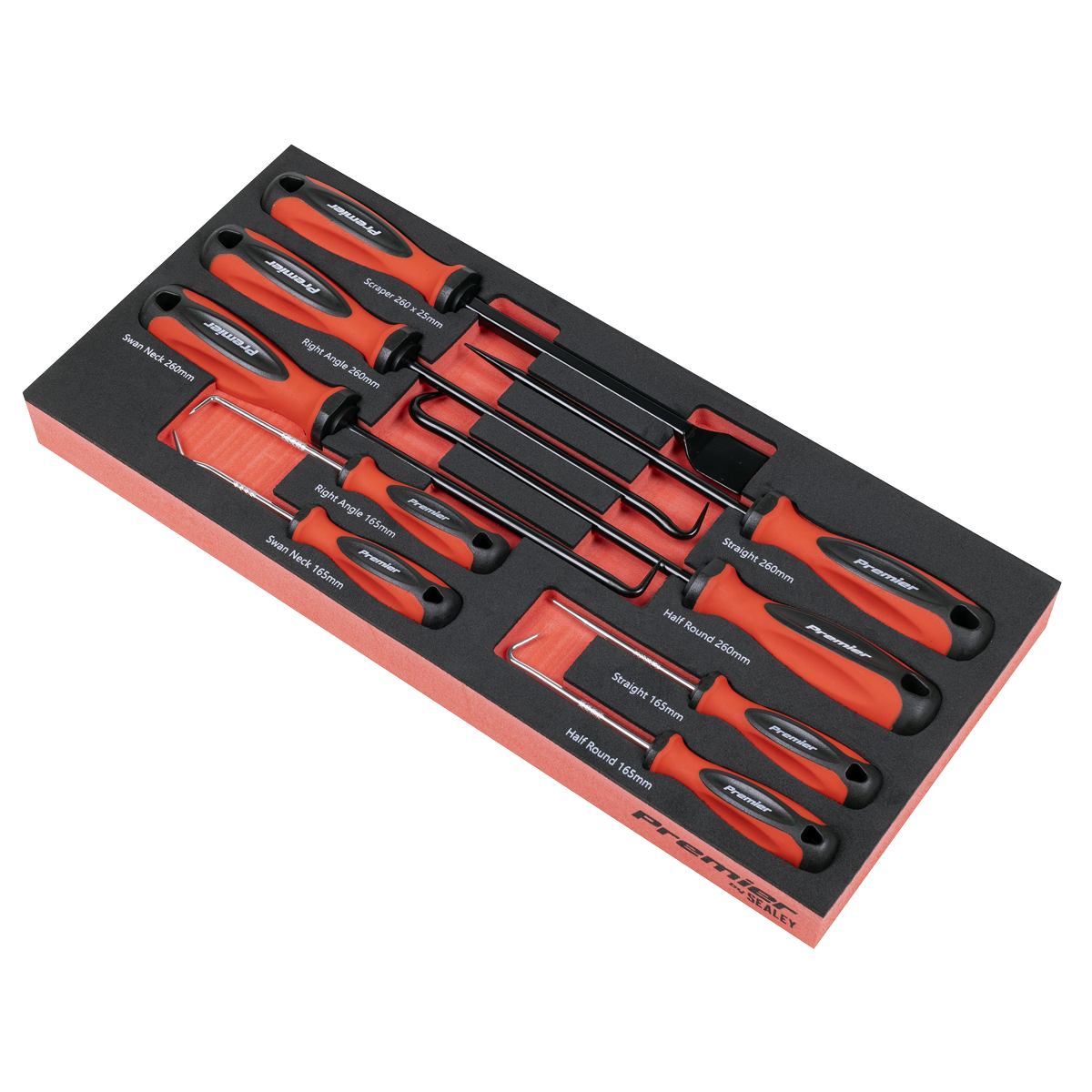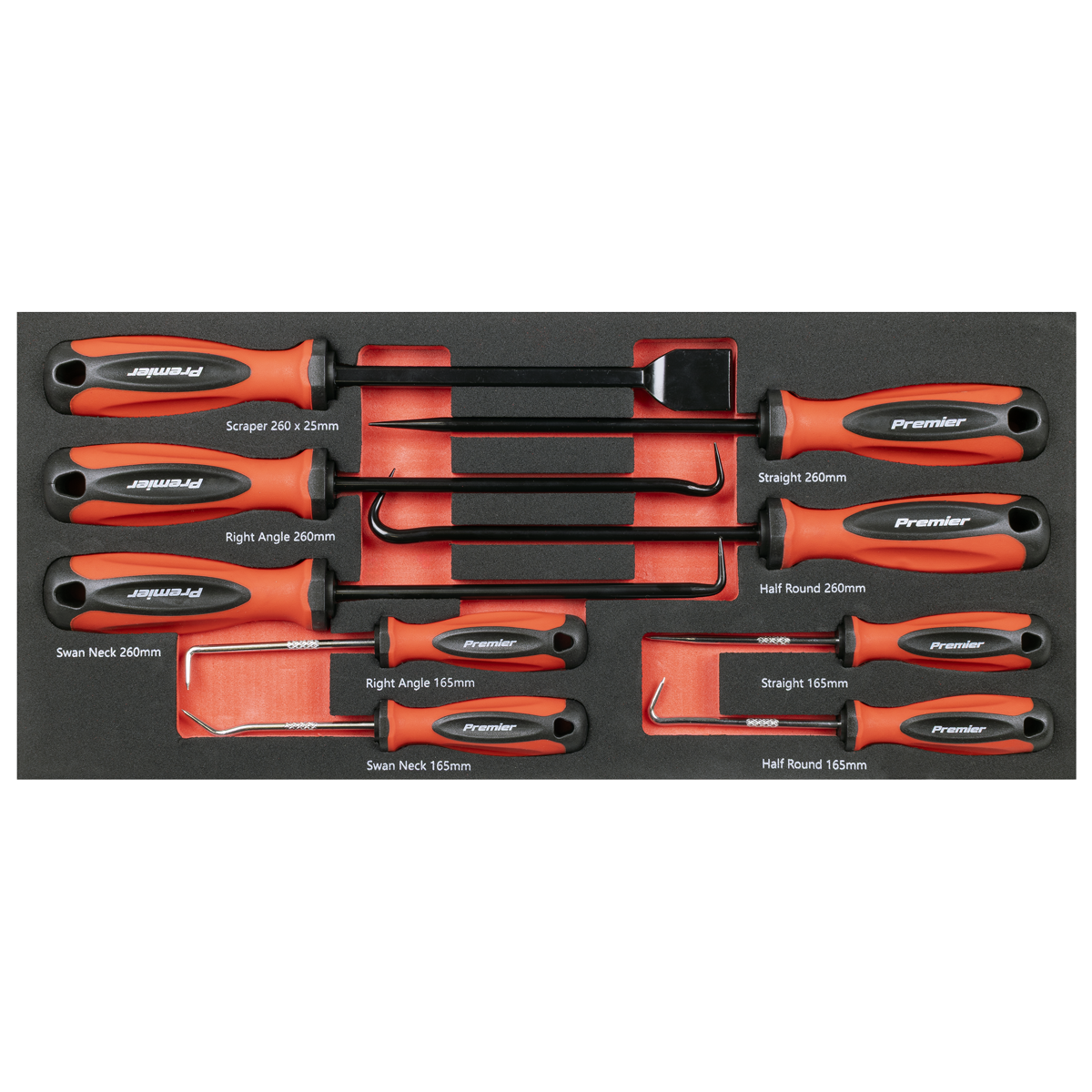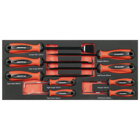 • 9PC SCRAPER AND HOOK SET - 165mm Picks; Straight, Right Angle, Half-Round, Swan Neck, Picks 260mm; Straight, Right Angle, Half-Round, Swan Neck, Scraper 260 x 25mm.