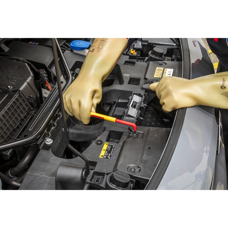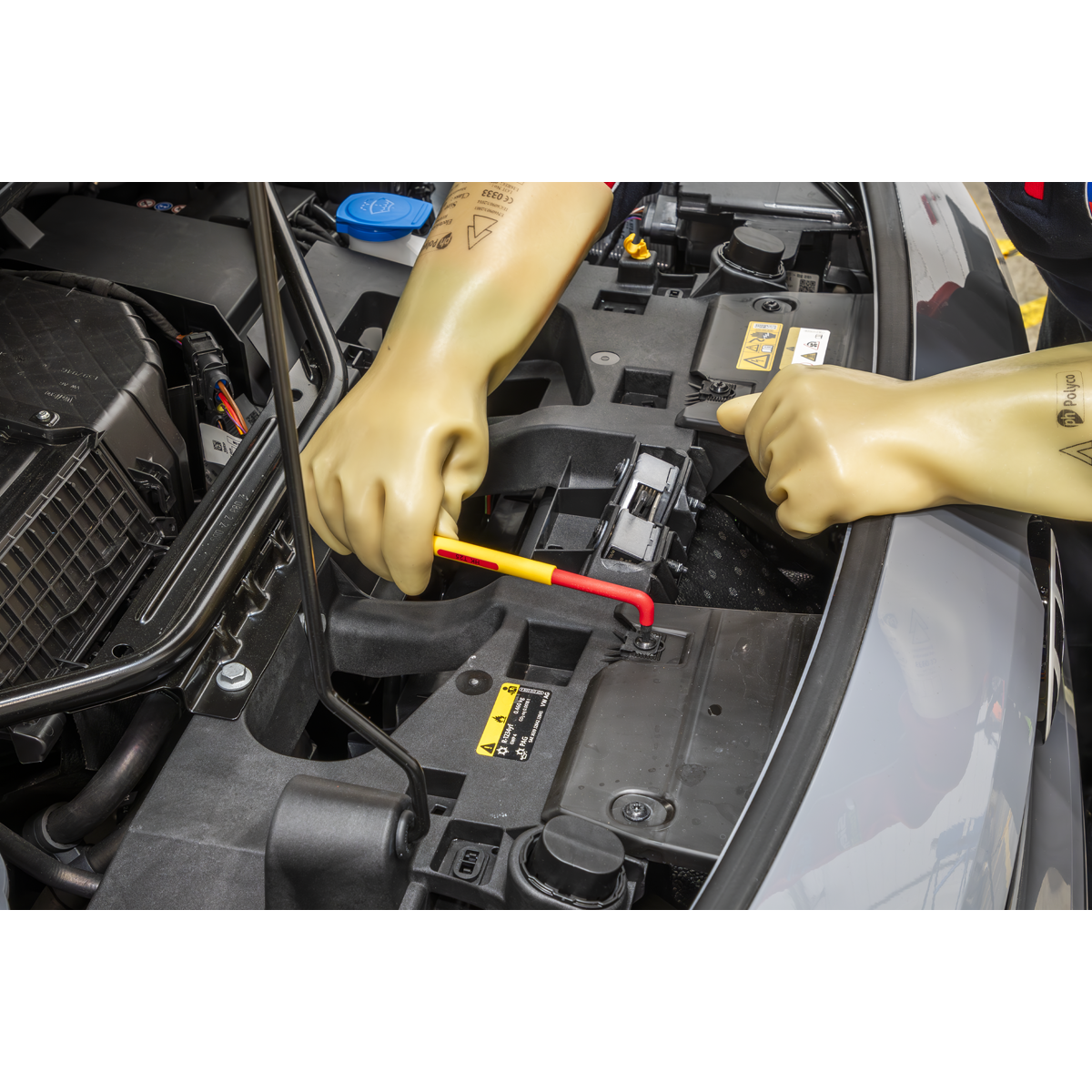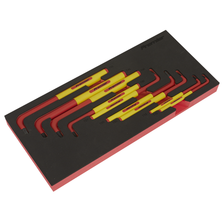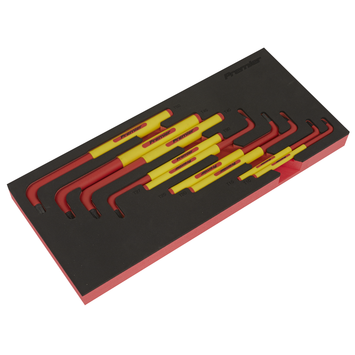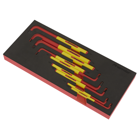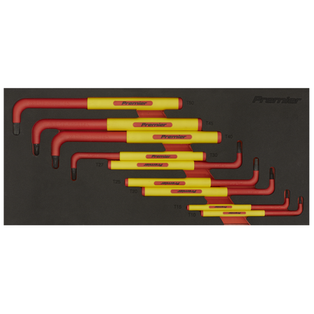 Manufactured from heat treated and hardened S2 steel with a chemically blackened finish for resistance to corrosion. Keys range in length from 135mm to 215mm and in size from T10 to T50. Fitted with PP/TPR handles, keys are fully insulated to VDE and EN 60900 standards to protect from electric shocks up to 1500V DC and 1000V AC. Ideal for technicians working on modern hybrid and electric vehicles (1500V DC safe live working). Also suitable for electricians and other trades (1000V AC safe live working). Contents: T10, T15, T20, T25, T27, T30, T40, T45, T50. Supplied in EVA foam storage tray.