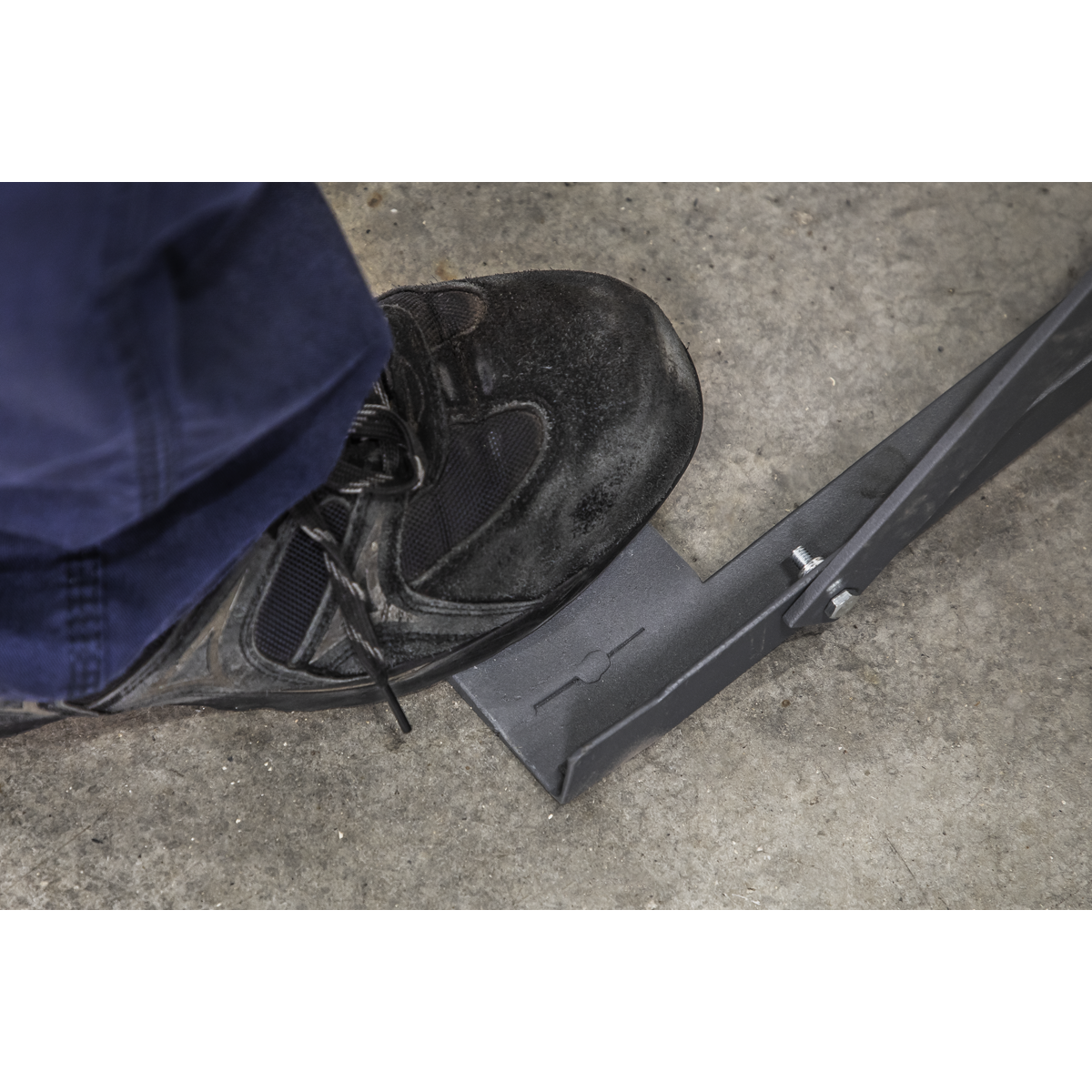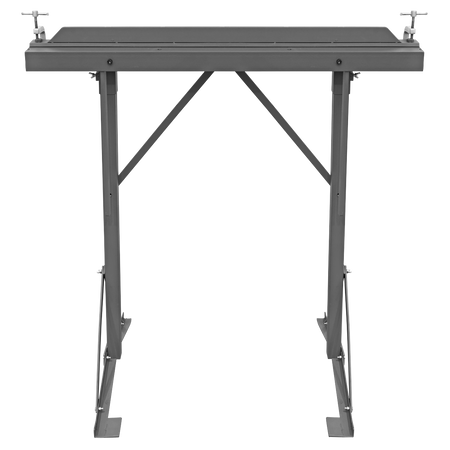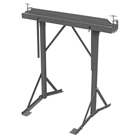Floor standing sheet metal folder, fitted with mounting plates. Capable of up to and beyond a 90° angle. The unique patented 'endless' design and removable folding plate allows the user to fold, channel and offset any length of sheet metal, by simply moving the sheet as required after each fold. Capable of two folds at right angles to each other to form a corner piece. With adjustable fold plate to help achieve the cleanest fold possible. When not in use, can be folded away quickly and easily for compact storage.