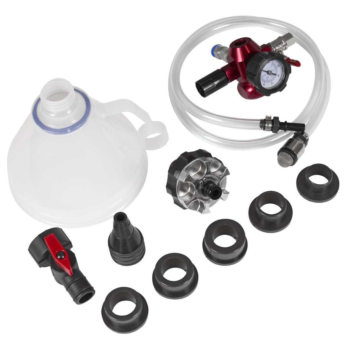 Eliminates the introduction of bubbles and airlocks into the cooling system and dramatically reduces system filling time. No more time-consuming cooling system bleeding and messy spills to clean up. Automatically conducts system leak test. Simple operation requires a workshop air supply and does not require a fiddly interchange of vacuum and fluid hoses. Refill the system by attaching the filler hose and opening the valve allowing your premixed coolant to flow into the system. The system can be filled manually via the funnel, which has a built-in shut-off valve that helps prevent airlocks. Supplied with a 1.25m filler hose, six reservoir adaptors 31, 35, 40, 42, 45mm, a cone adaptor and a storage case.