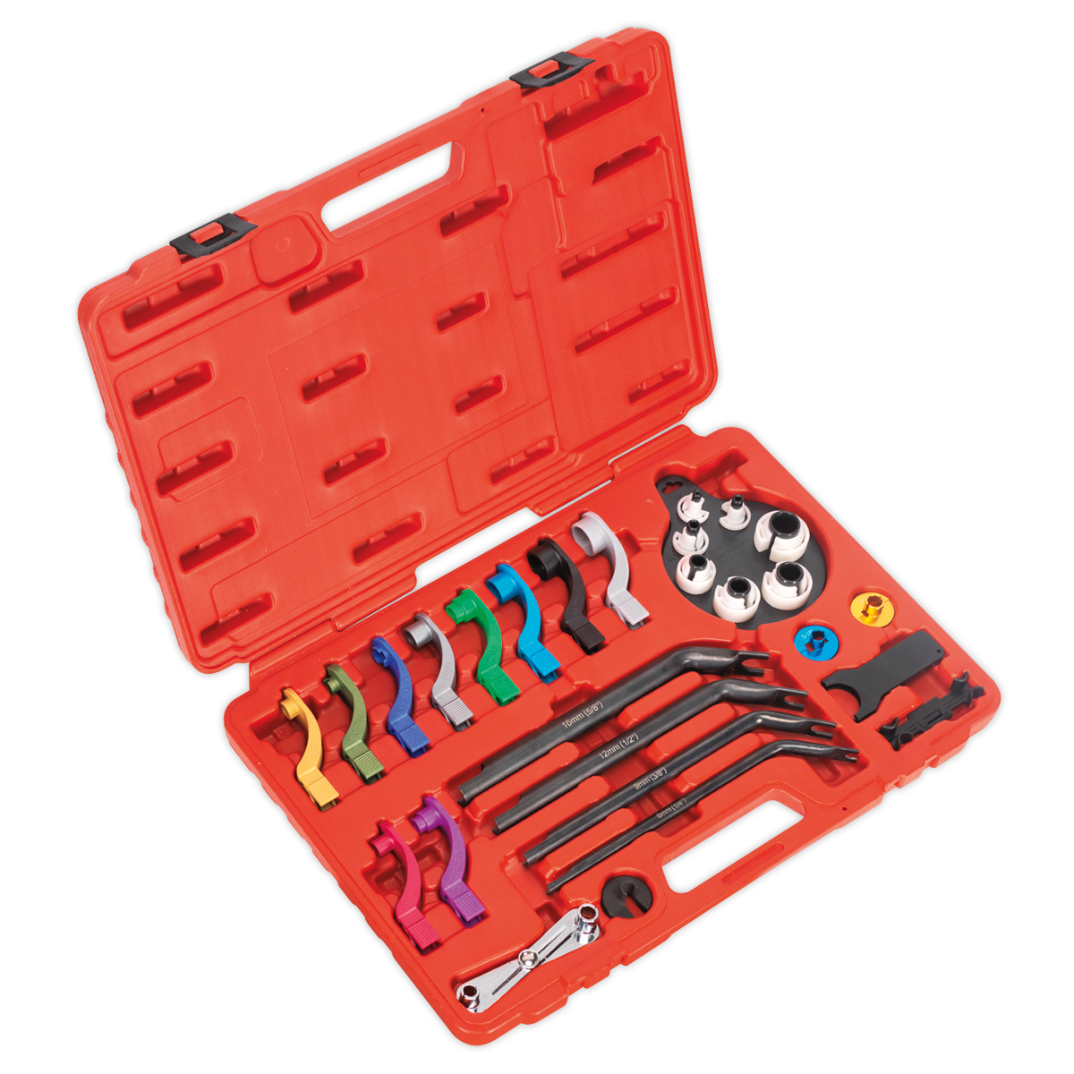 Comprehensive automotive fuel line and air conditioning hose disconnection kit. Suitable for a wide variety of vehicles. Designed for radiators, transmissions, oil coolers and power steering lines. Compatible with low profile fuel lines on a range of Ford and Vauxhall/Opel models. Supplied in storage case.