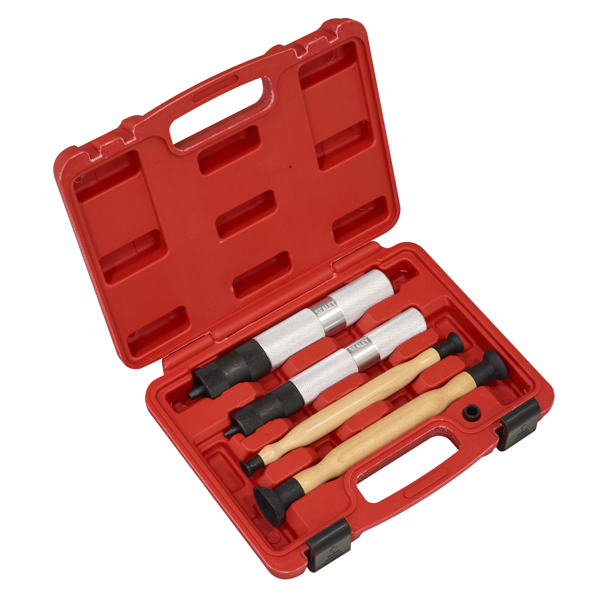 For quick removal/installation of valve collets with cylinder head in situ or on workbench. Remove/install by firmly pushing or tapping the tool with a hammer. The magnet in the tool captures the collets. Ideal for replacing broken valve springs or valve stem oil seals without removing the head from the engine. For use in situ, a suitable adaptor will be required to allow compressed air into the combustion chamber to hold the valve closed while compressing the valve spring. The Set also includes two valve lapping tools with wooden shafts and four sizes of rubber suction cups. Suitable for grinding most engine valves. Supplied in a storage case.