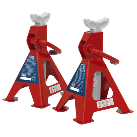 Ratchet type axle stands with cast iron support posts and tough steel plate welded base. Angled teeth in post prevent accidental release of load - the more weight applied, the tighter the post is locked. Sold in pairs.