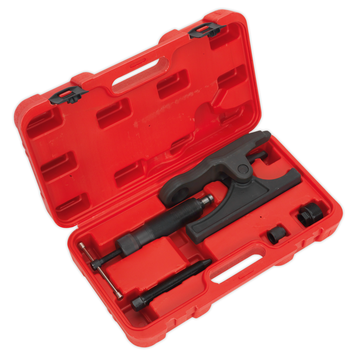 Heavy-duty ball joint splitter suitable for commercial vehicles. Specially designed to be operated manually or by 10 Tonne hydraulic ram (supplied). Features a step down thread adaptor that allows fitting of the manual thrust screw or hydraulic ram. Hydraulic ram interchangeable with Model No. PS990.,• Heavy-duty ball joint splitter suitable for commercial vehicles.