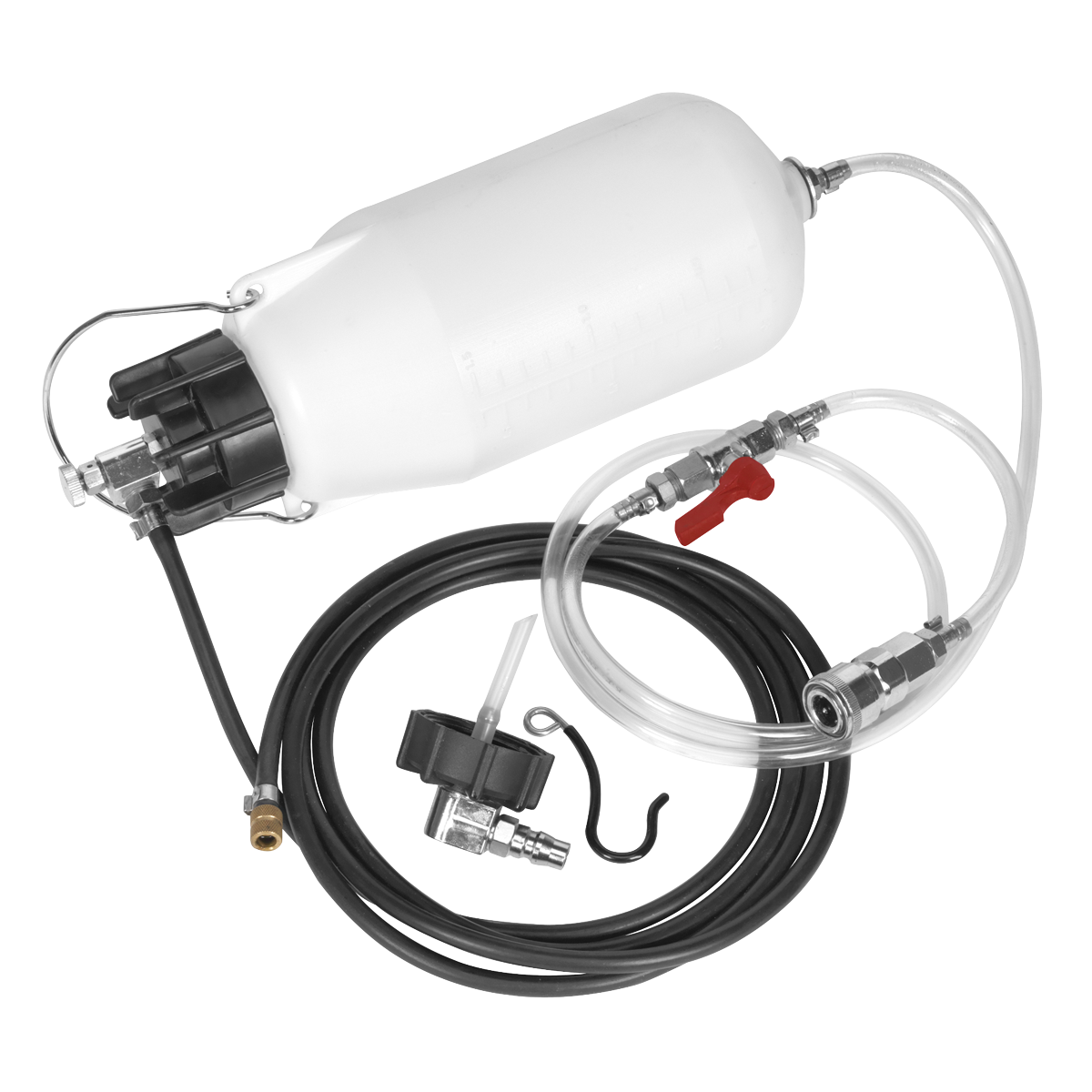 Professional one-person brake and clutch bleeder that uses air from the vehicle tyre. Reservoir holds 1.5L of hydraulic fluid - flush the entire system with one fill without the risk of running the reservoir dry. Maximum pressure of 30psi makes the unit suitable for ABS systems. Features a fluid shut-off valve to prevent accidental spillage and air pressure release valve. Fitted with 45mm cap with 90deg angled connector which is suitable for most European models. For a selection of alternative Brake & Clutch Bleeder Caps, order Model No's; VS820SA, VS820UA, VS0204B, VS0204T, VS0204V4 and VS0204C.,• Professional one-person brake and clutch bleeder that uses air from the vehicle tyre.