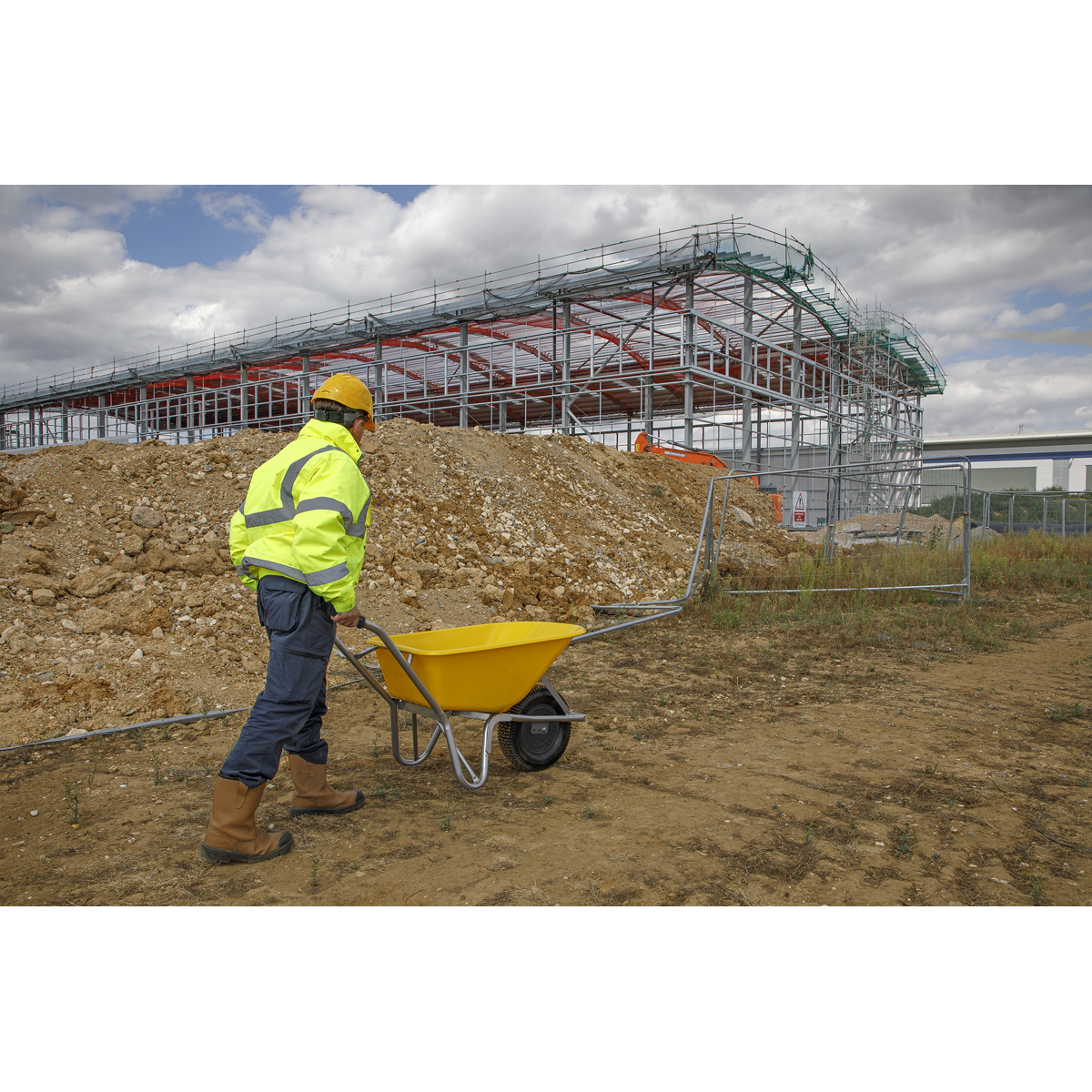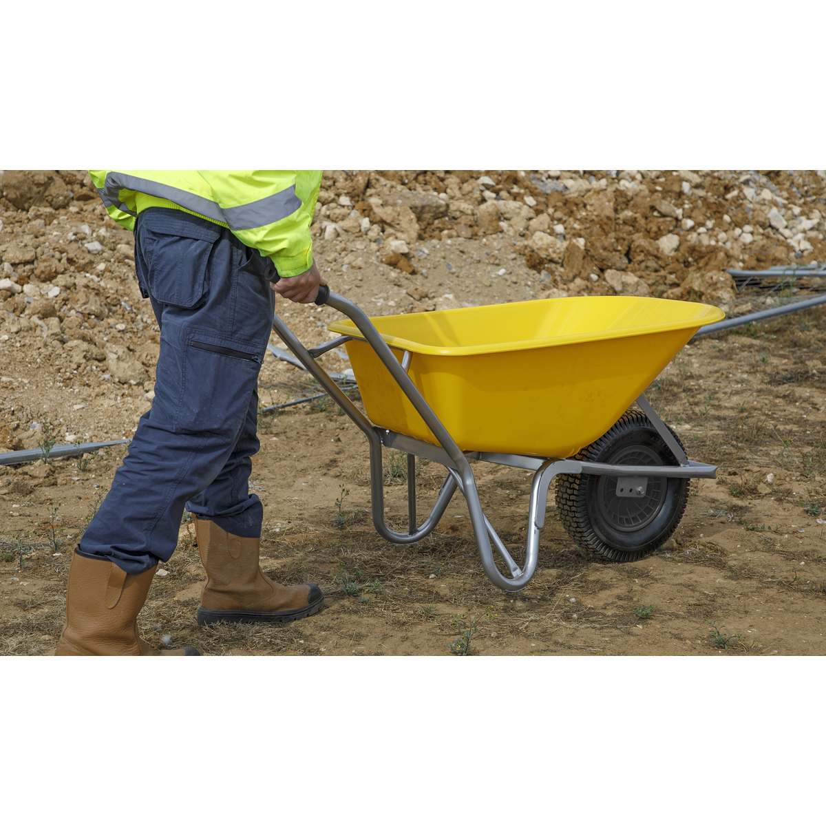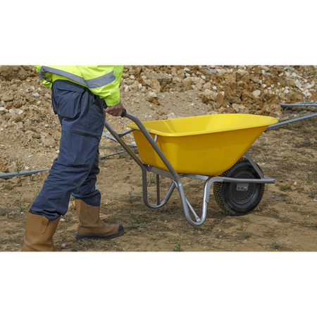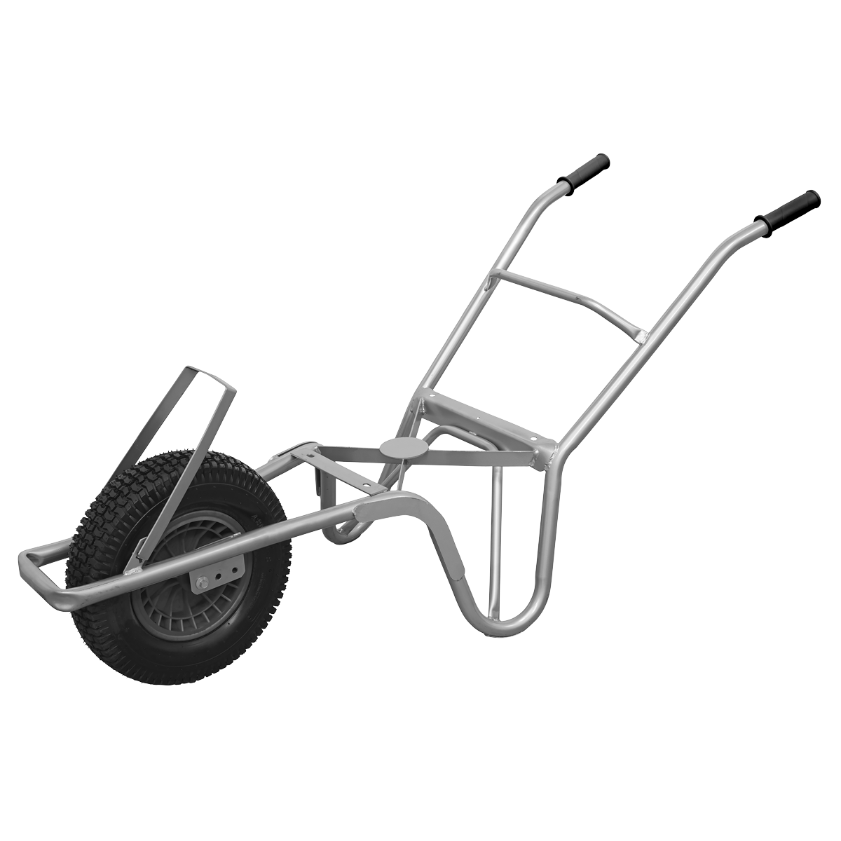 Heavy-duty wheelbarrow ideal for construction as well as general domestic use. Our wheelbarrows use air filled pneumatic tyres, perfect for absorbing impact and are ideal for use on uneven surfaces and rough terrain. Constructed with strong tubular steel frame and rubber gripped handles. Wheel Size: Ø390mm.