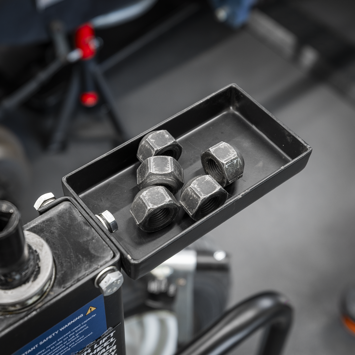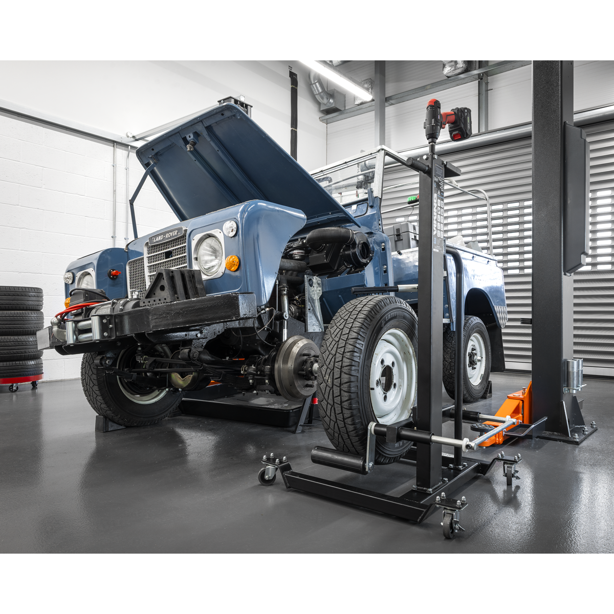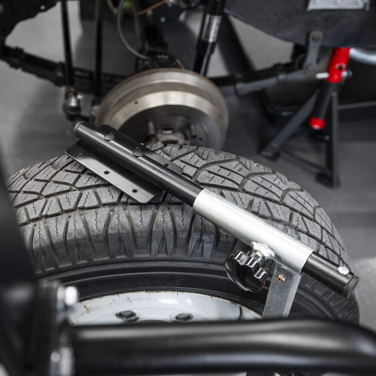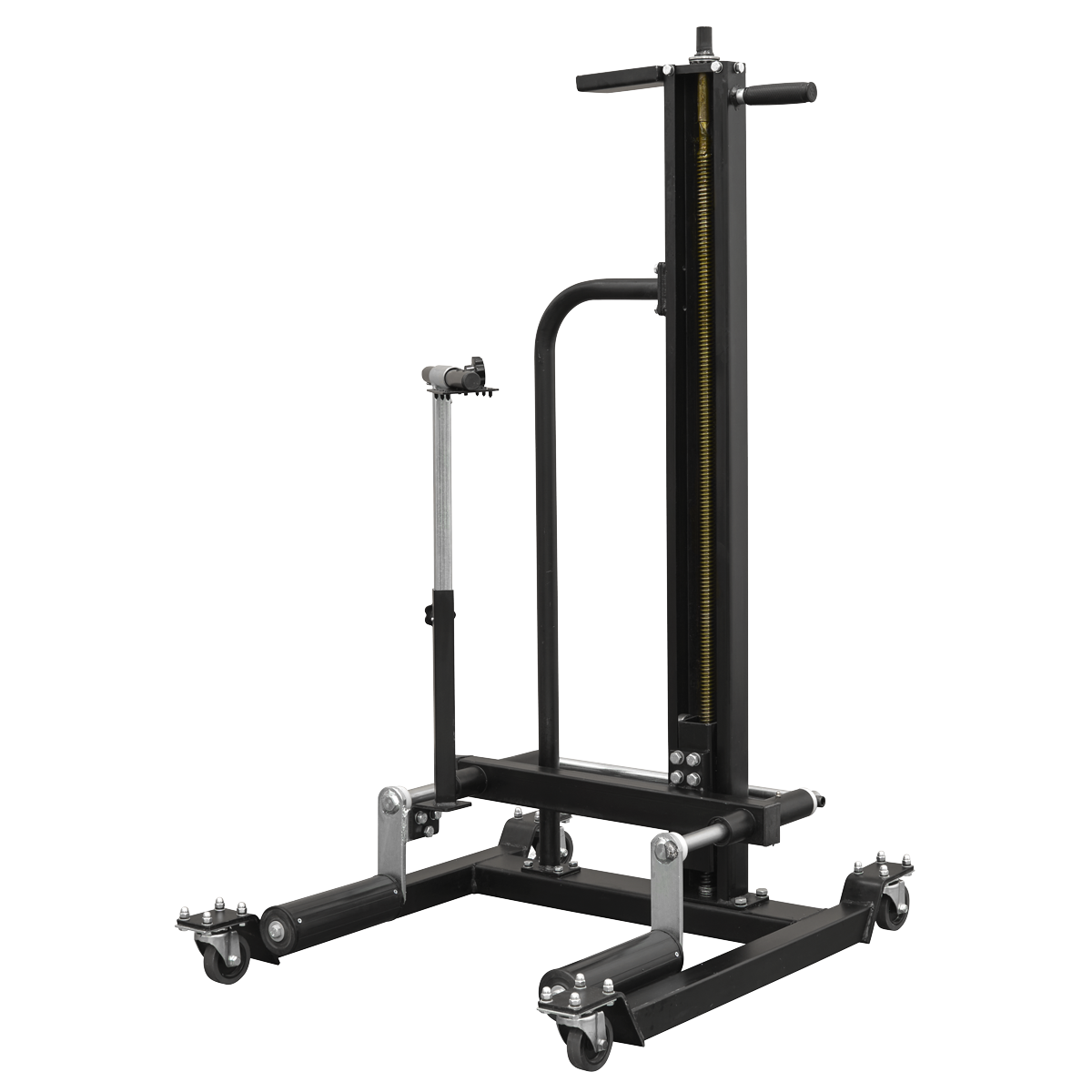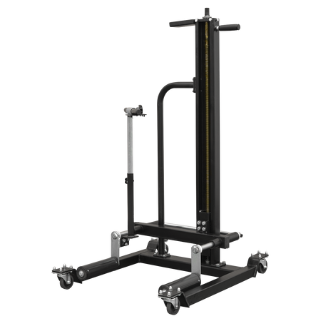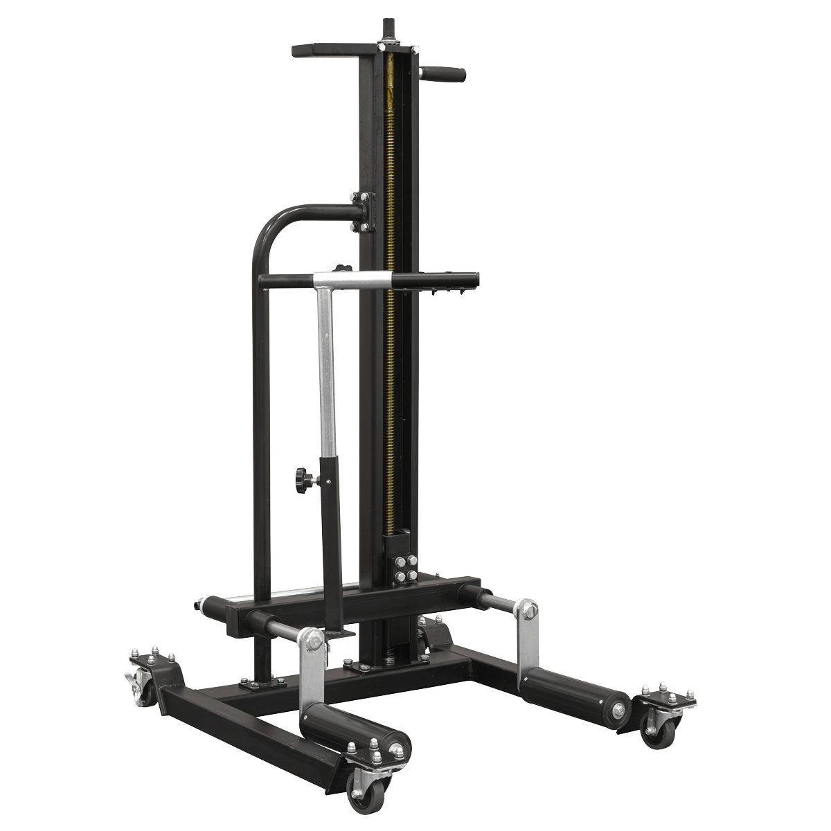 Lifting mechanism reaches height up to 1078mm. Raised using an impact gun reducing time and effort needed to raise the roller arms to the wheel. Solid steel construction, with friction mounted roller arms. Front and lockable rear castors for easy manoeuvrability and stability. Supplied with safety bar to prevent wheel from tipping forward.