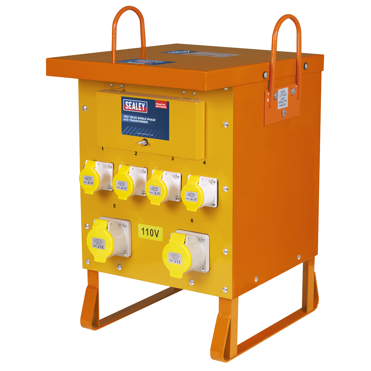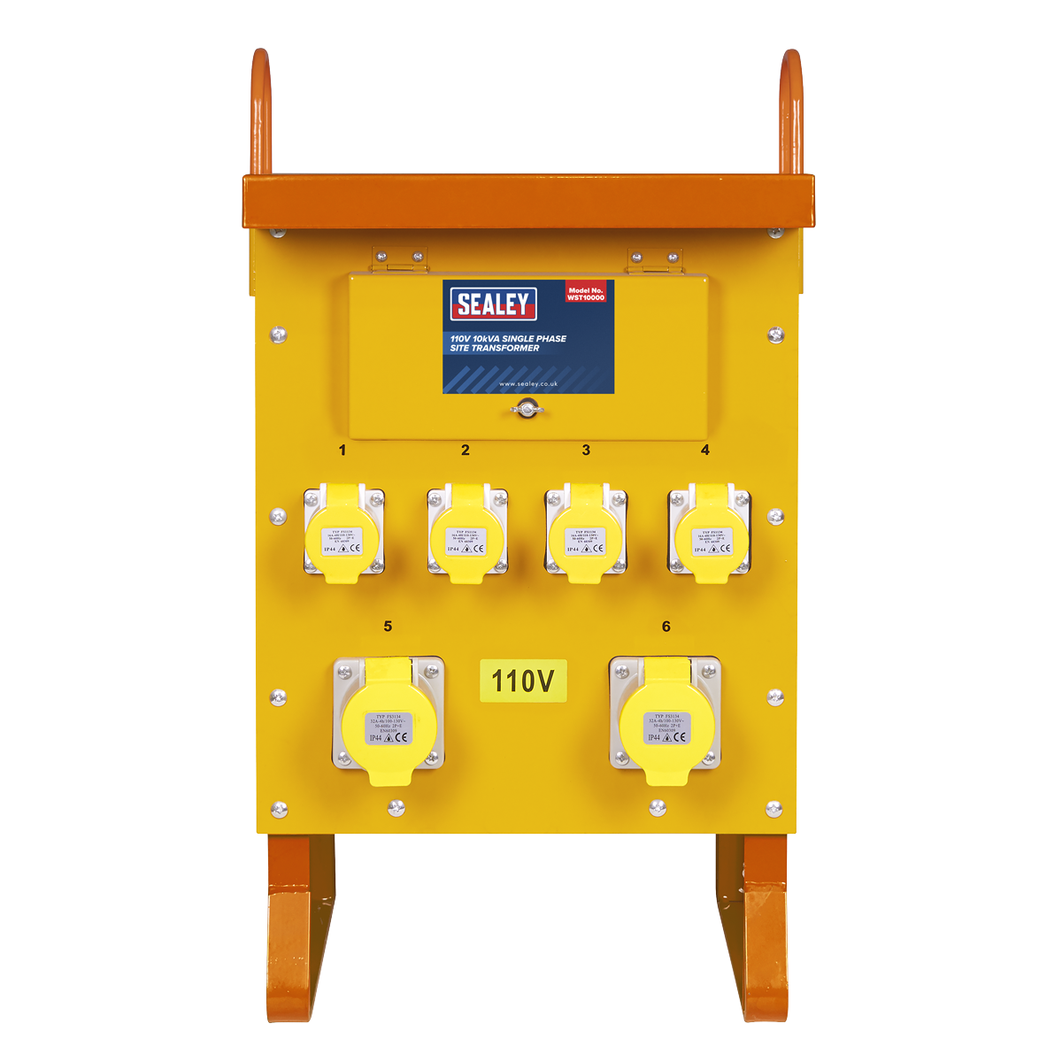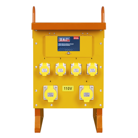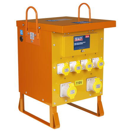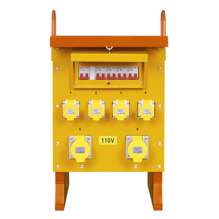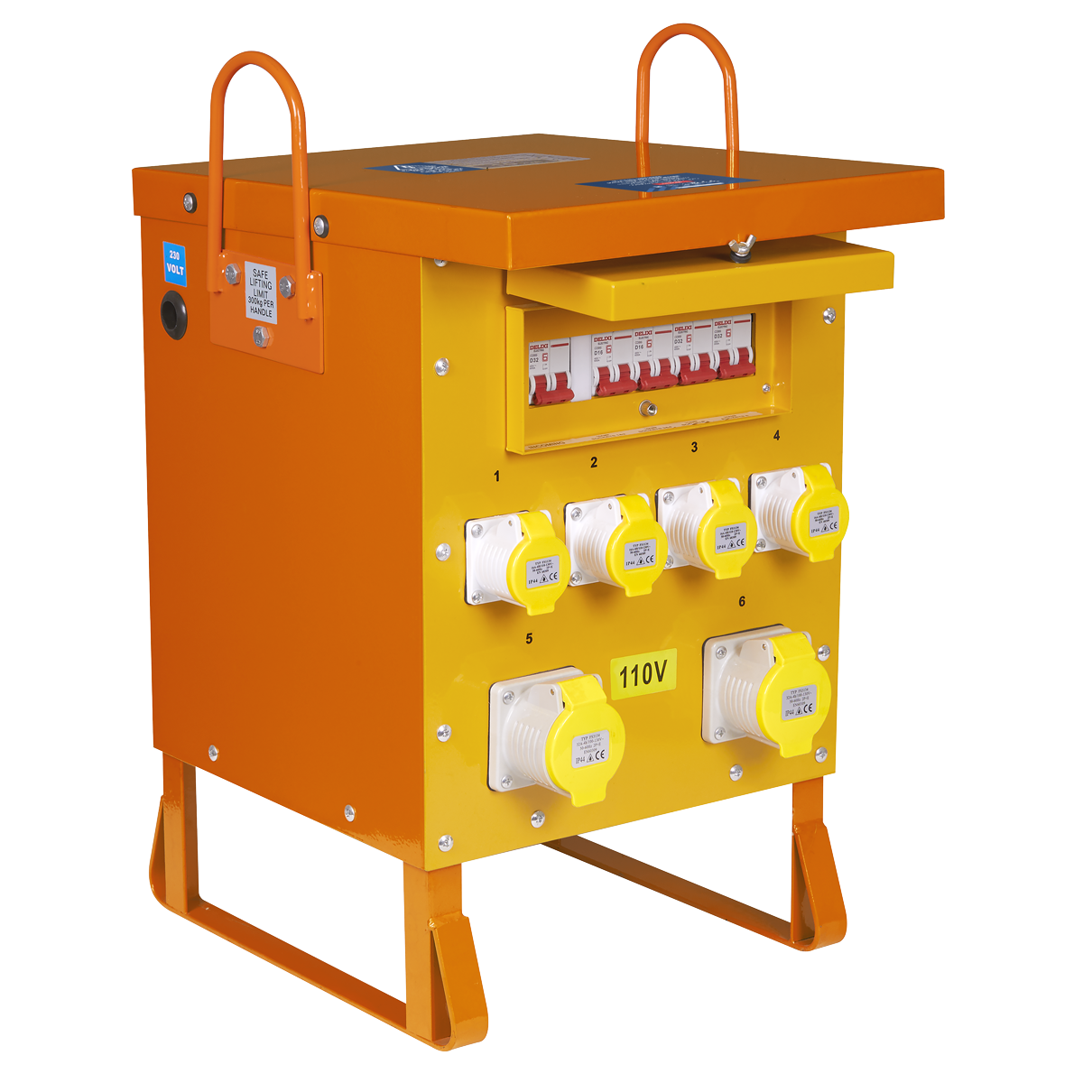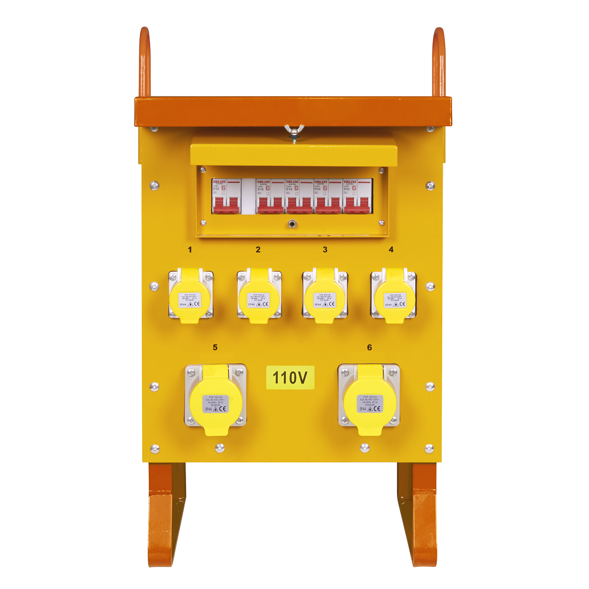 110V Transformer with tool rated performance suitable for intermittent running of power tools and continuous running of lighting products within specified capacity. IP44 Rated unit with steel case and heavy-duty handles to aid positioning. Fitted with miniature circuit breaker to prevent overload. Supplied with 2 x 32A/110V sockets and 4 x 16A/110V sockets.