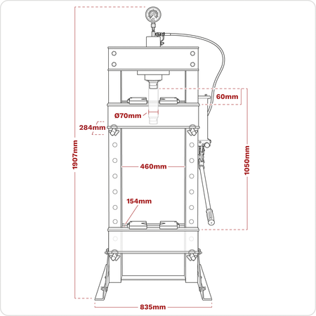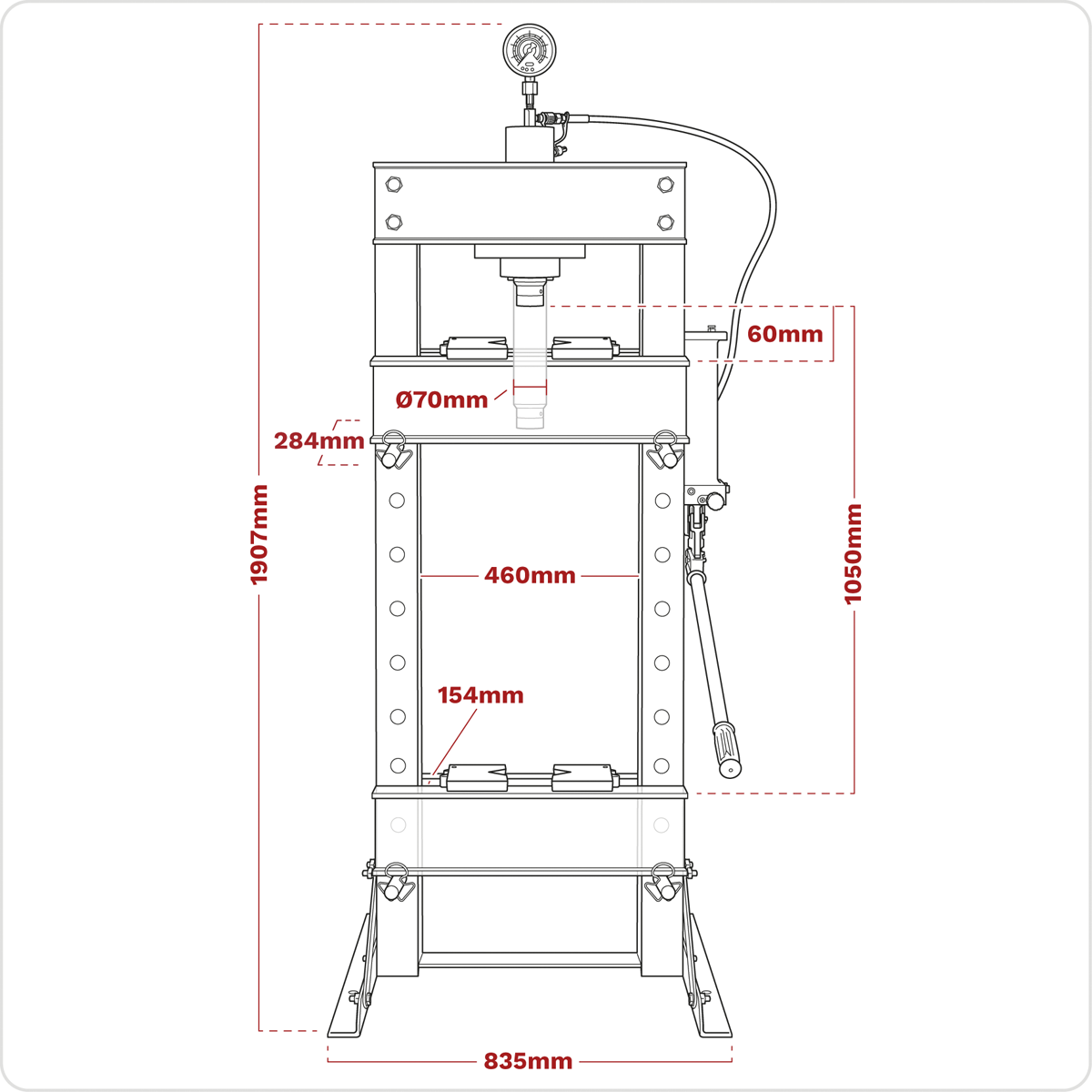 Steel frame construction with side mounted hydraulic pump unit. Sliding hydraulic ram assembly giving 200mm of lateral travel for off-centre pressing applications. Includes flat pressing plate/V-blocks. Fitted with ram pressure gauge.