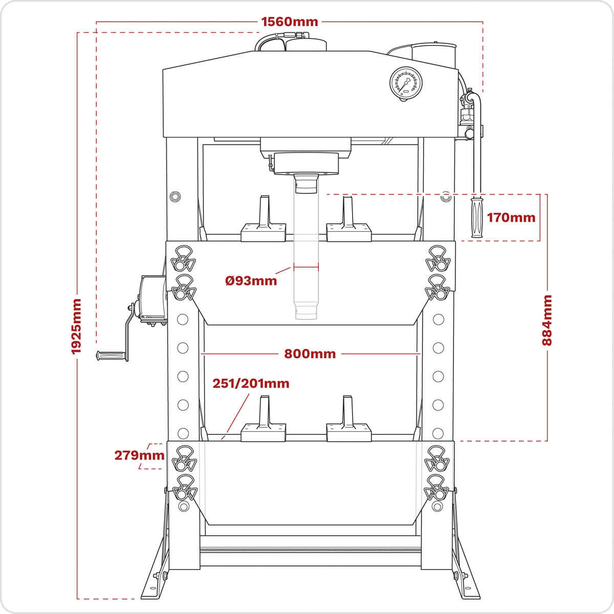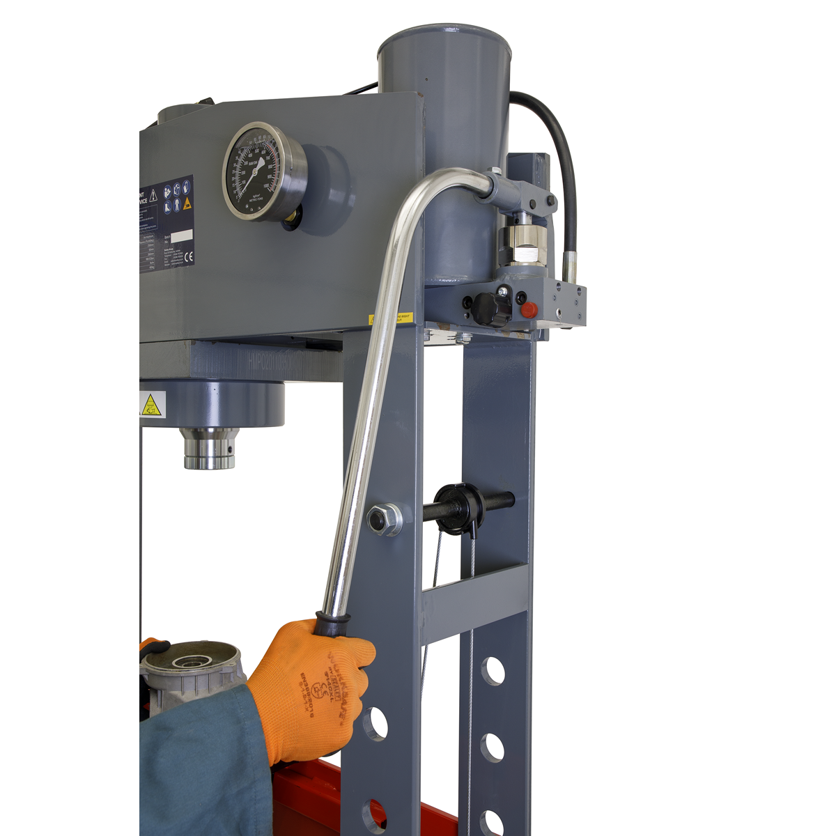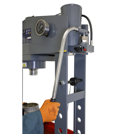 Steel frame construction with 2-speed hydraulic pump unit. Sliding hydraulic ram assembly giving 260mm of lateral travel for off-centre pressing applications. Fitted with ram pressure gauge and supplied with flat pressing plate/V-blocks.